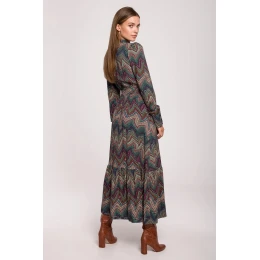 Maximální pohodlí, maximální elegance v podobě maxi šatů s aztéckým potiskem, nařaseným spodním lemem a stojáčkem. Nejlépe se doplňují s vysokými botami.
