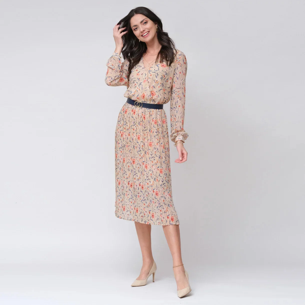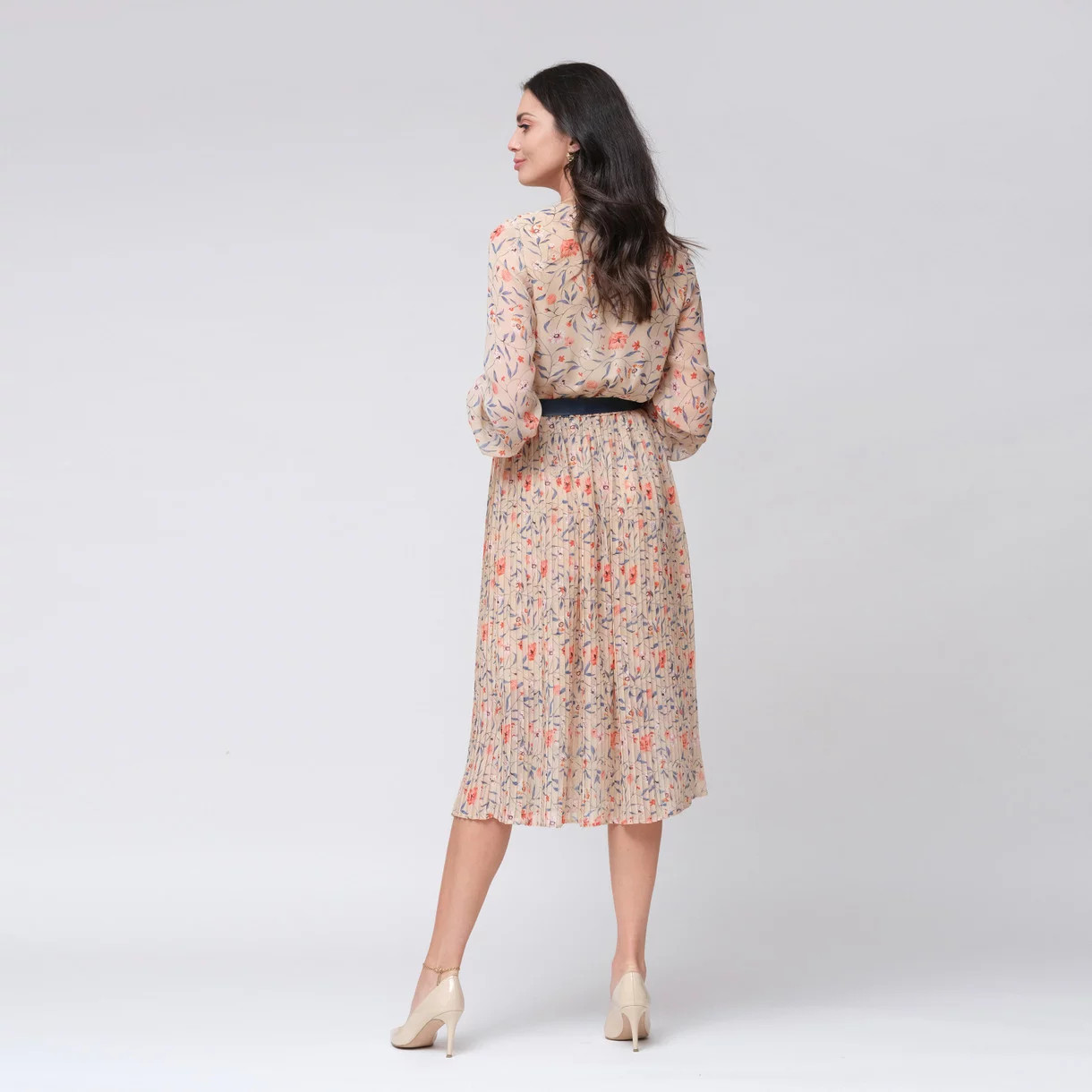 Dlouhé plisované květinové šaty s dlouhými rukávy a nabíranou plisovanou sukní.