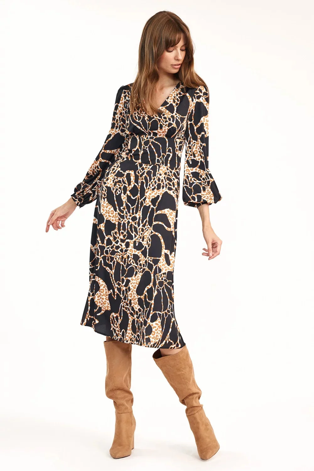 Vzorované midi šaty jsou kouskem, který by měl mít v šatníku každý! Tento model je ideální pro práci i každodenní použití. Materiál se výrazně přizpůsobuje siluetě. Šaty zdůrazňují pas. Výstřih do V prodlužuje krk. Dlouhé rukávy zakončené bufetem dodávají originální vzhled. S tímto vzorem se nemusíte starat o doplňky, je to úžasná dekorace sama o sobě.