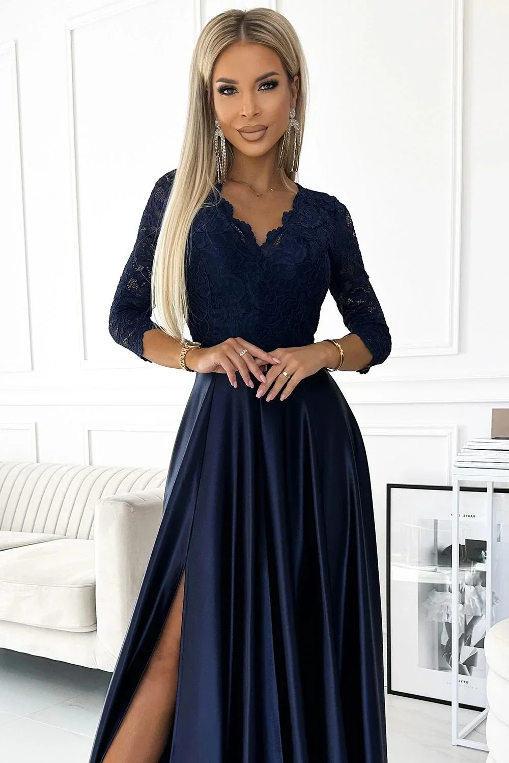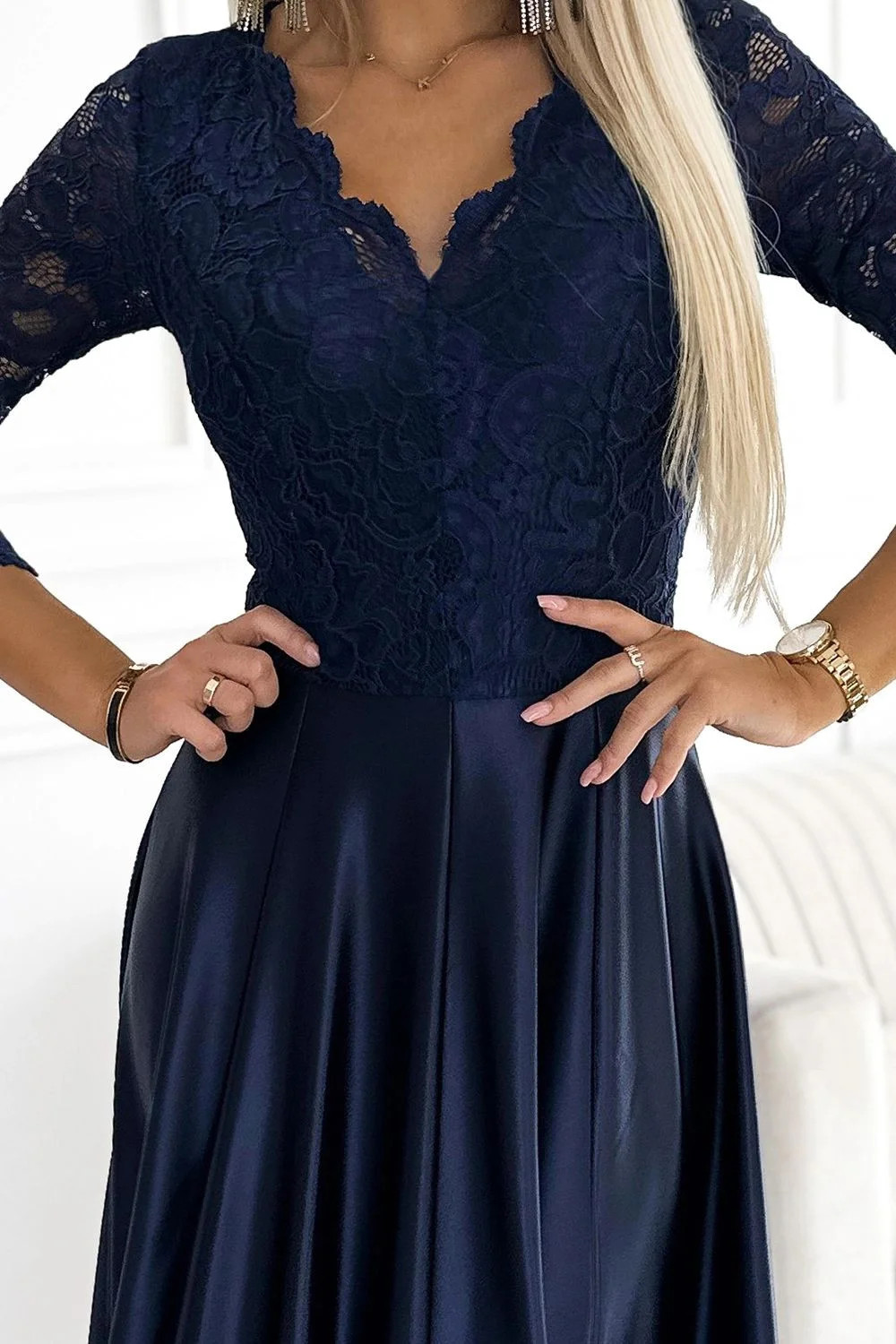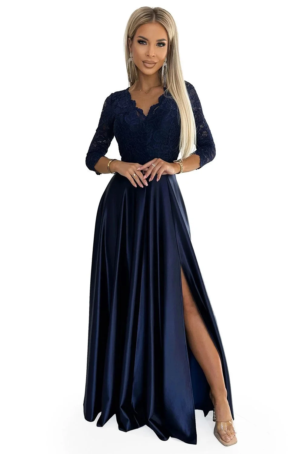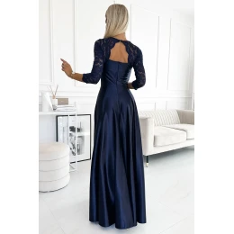 Dámské šaty 309-7 AMBER NUMOCO - tmavě modrá barva - elegantní střih - tříčtvrteční rukávy - krajkové šaty s výstřihem - s rozparkem