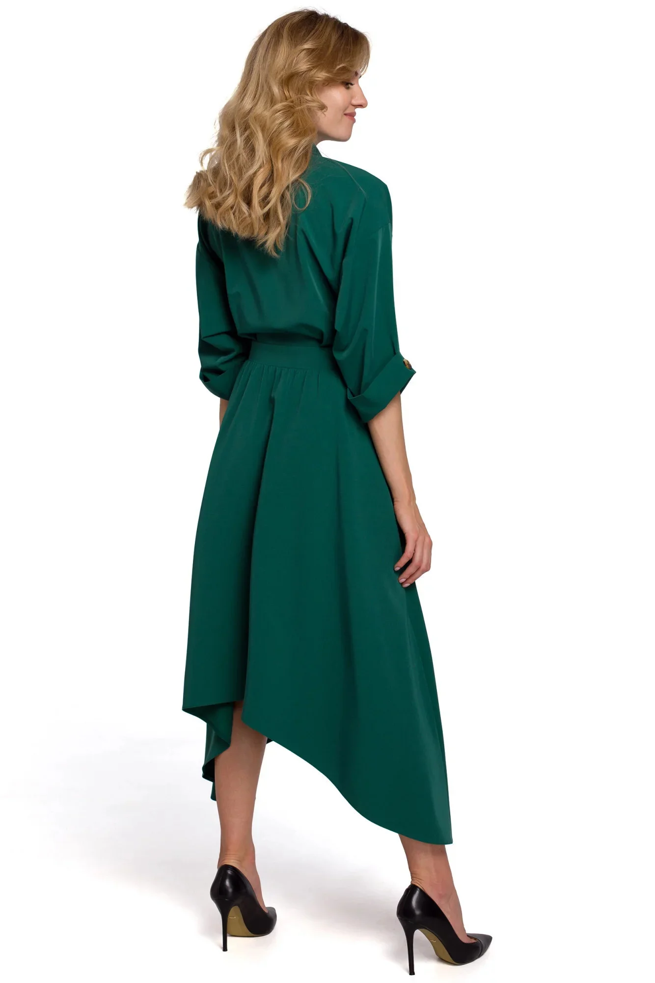 Tyto krásné klasické šaty mají uvolněný horní díl s límcem a širšími ohrnutými rukávy. Rozměrná sukně má asymetrický lem a ozdobné knoflíky v pase. Jsou to elegantní šaty do města, které se hodí do práce i na večerní procházku.