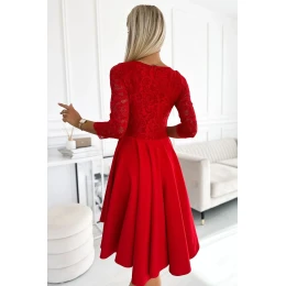 Dámské šaty 210-16 NICOLLE NUMOCO - červená barva - asymetrický střih - tříčtvrteční rukávy - hluboký výstřih lemovaný krajkou - zadní strana sukně je prodloužená