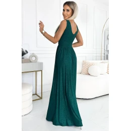 Dámské šaty 490-3 SUSAN NUMOCO - zelená barva - otevřený výstřih - prošívání v pase - rozparek - elastický materiál se třpytkami - ideální na svatby, plesy