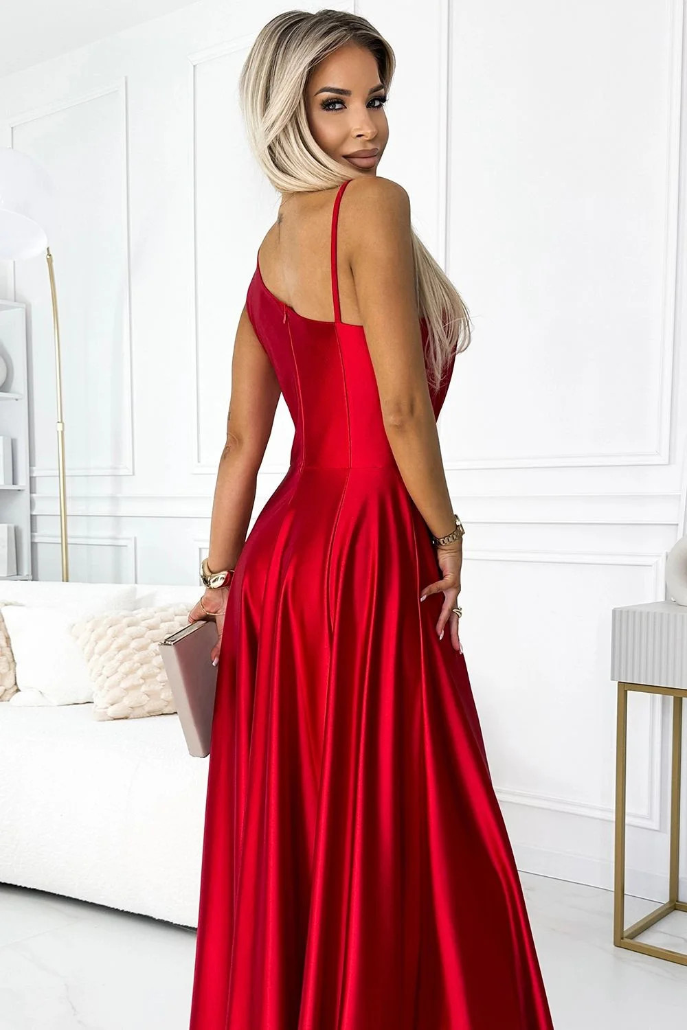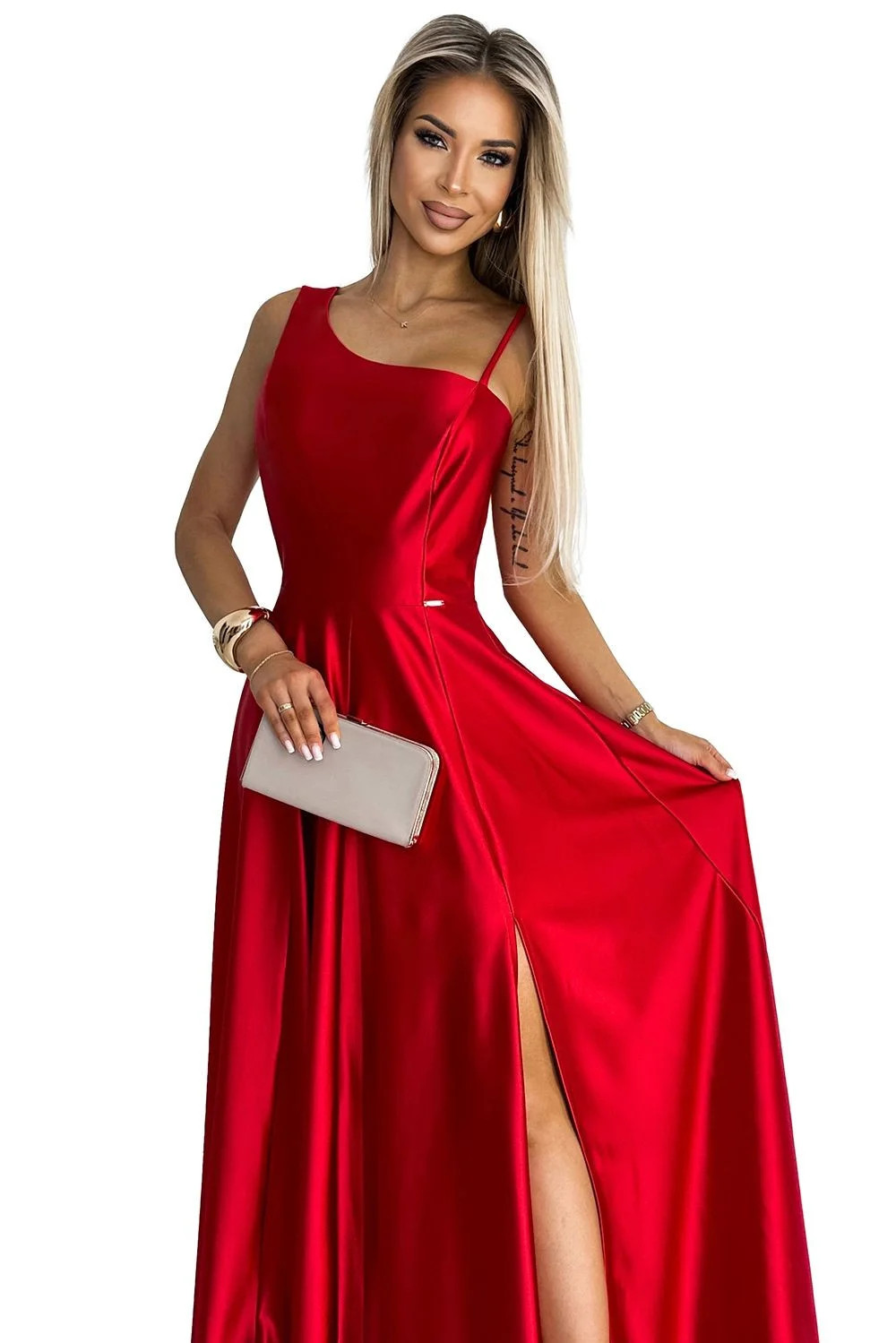 Dámské šaty 524-1 NUMOCO - červená barva - z lesklého, hladkého a lehce elastického saténu - maxi dlouhé s jedním širokým ramínkem - rozparek