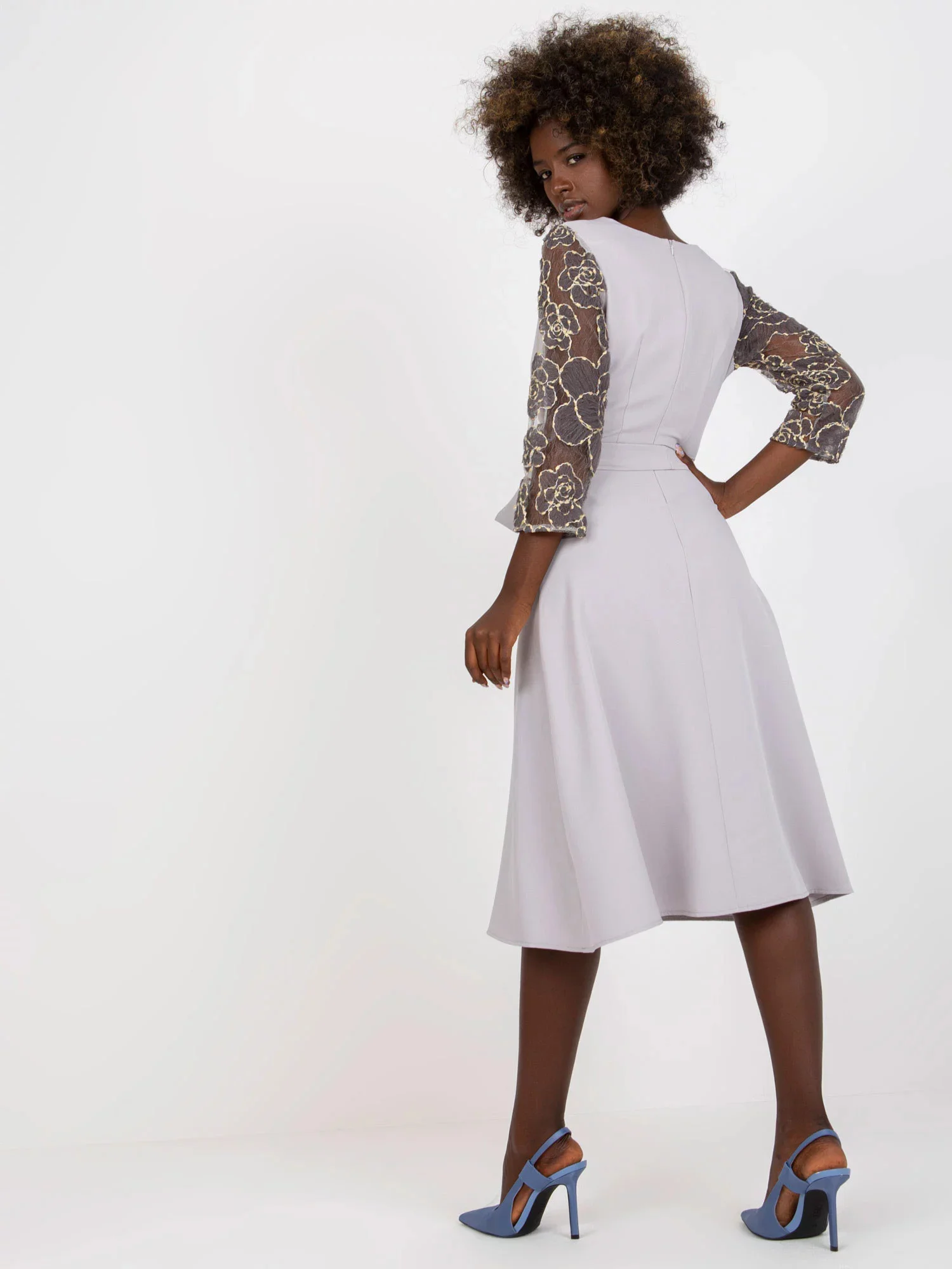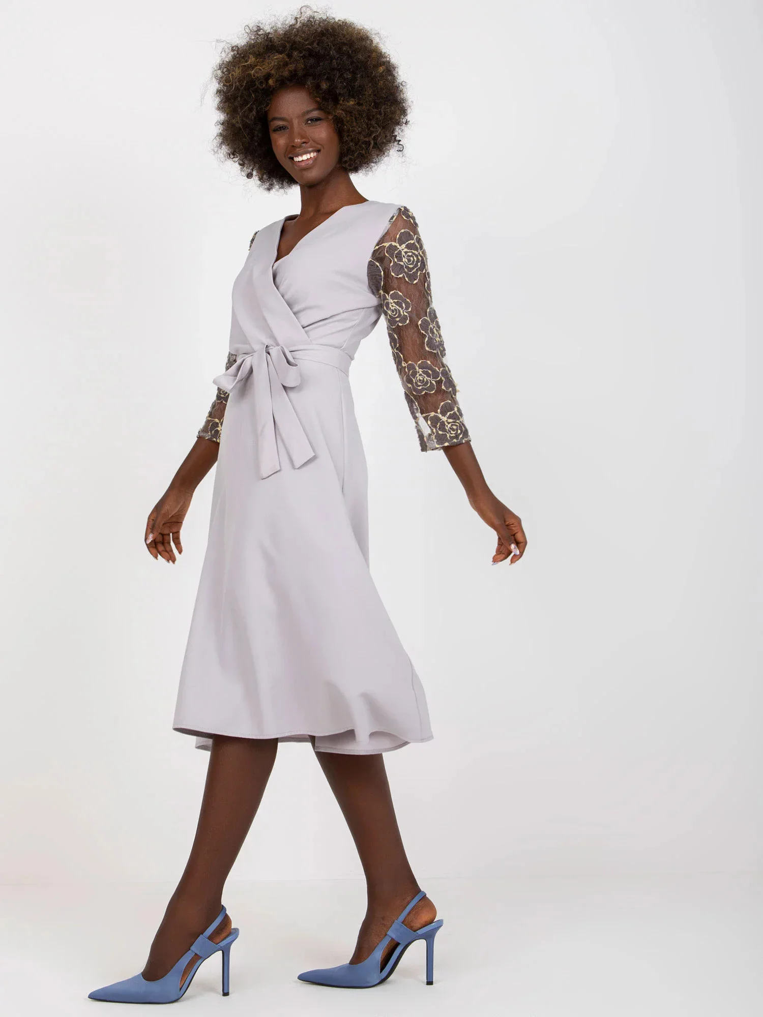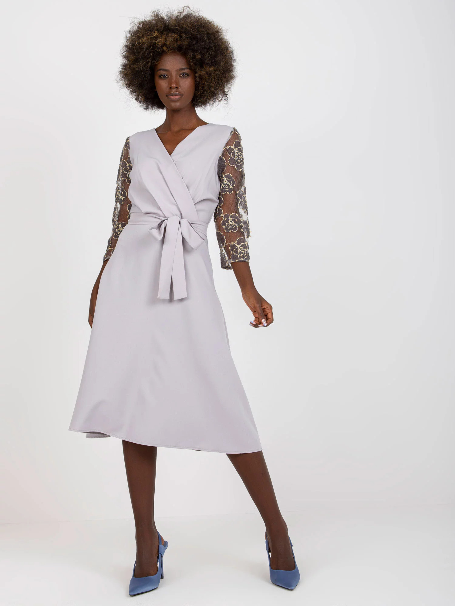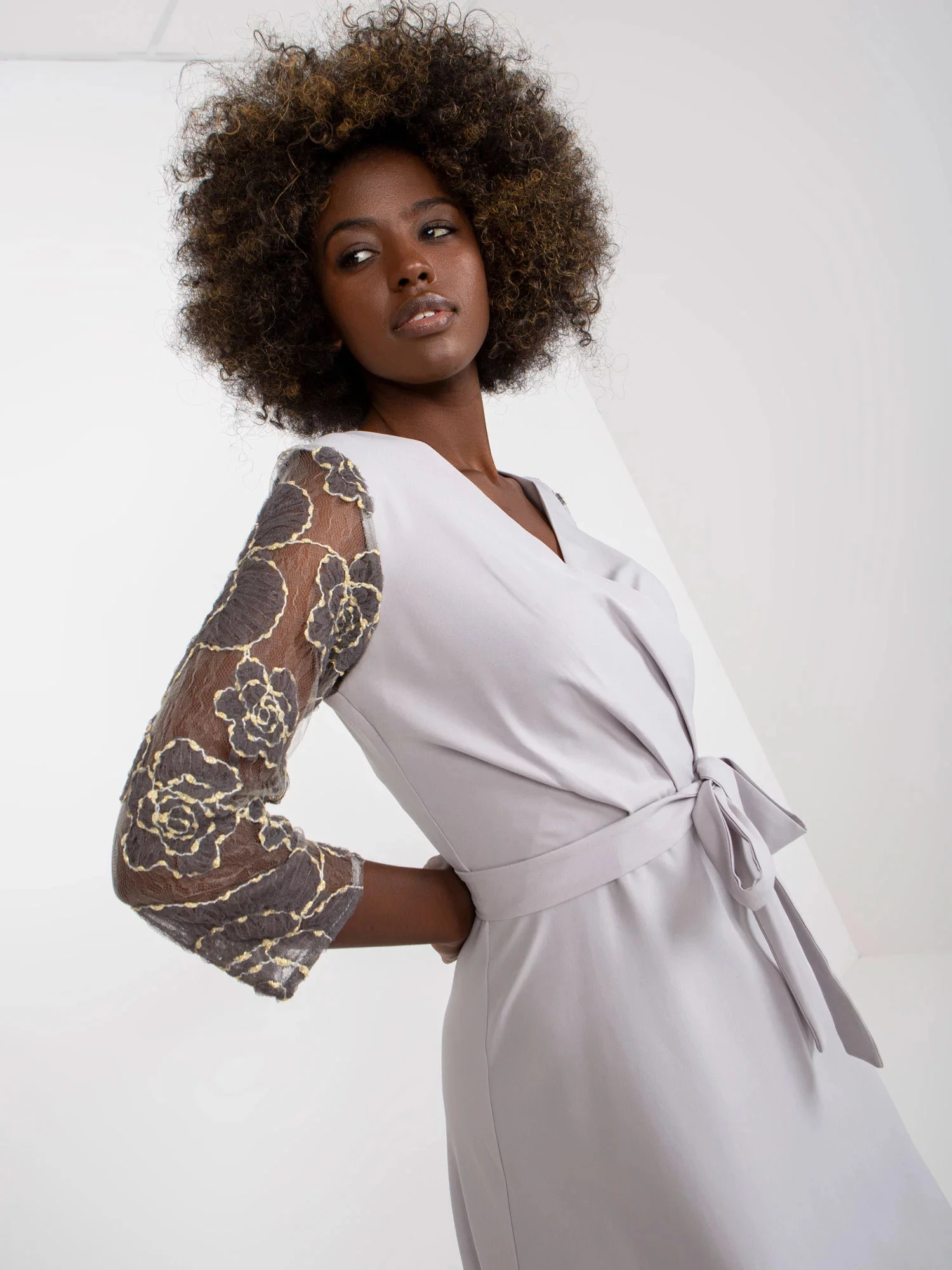 Dámské šaty s průhlednými krajkovými rukávy, zavazování v pase.