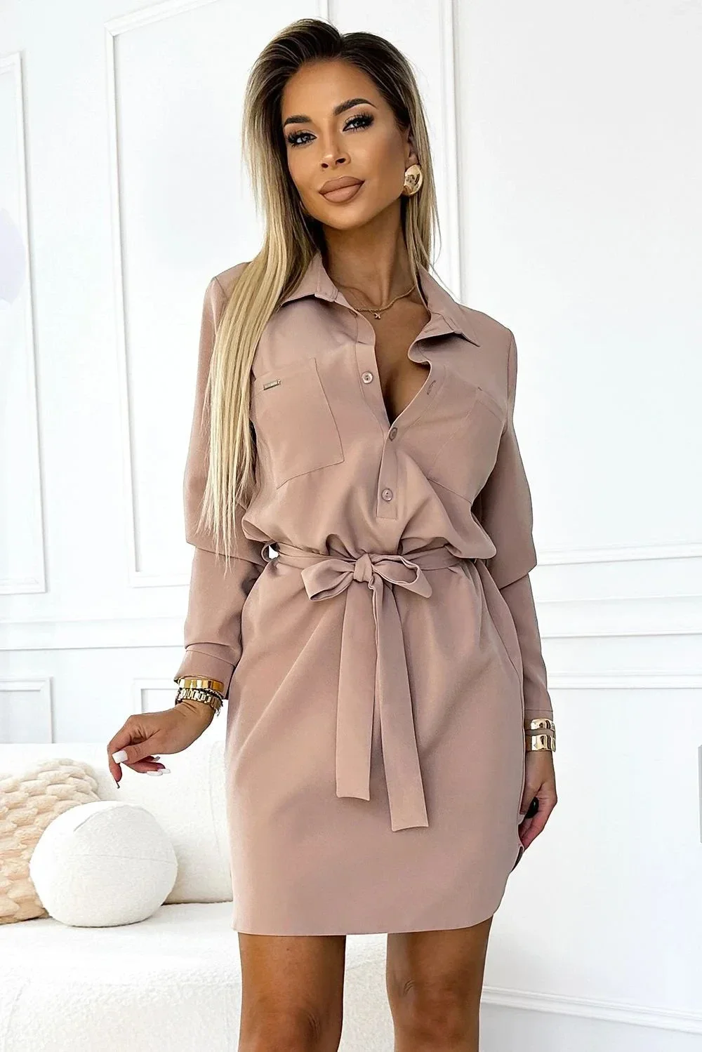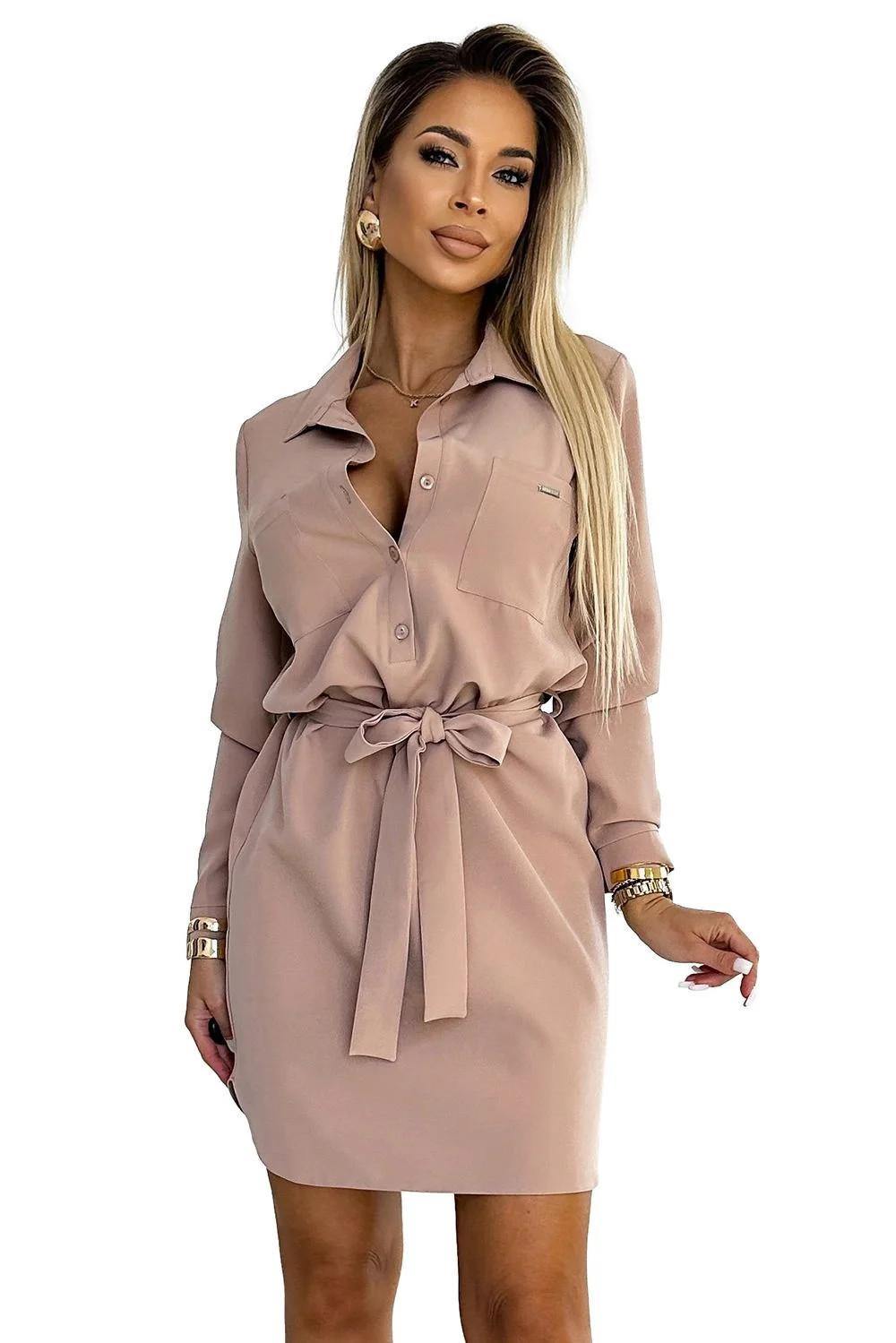 Dámské šaty 284-2 CAMILLE NUMOCO - béžová barva - košilového typu - límeček a zapínání na knoflíky - dlouhé rukávy zakončené manžetami s knoflíčkem - s kapsami - na zavazování