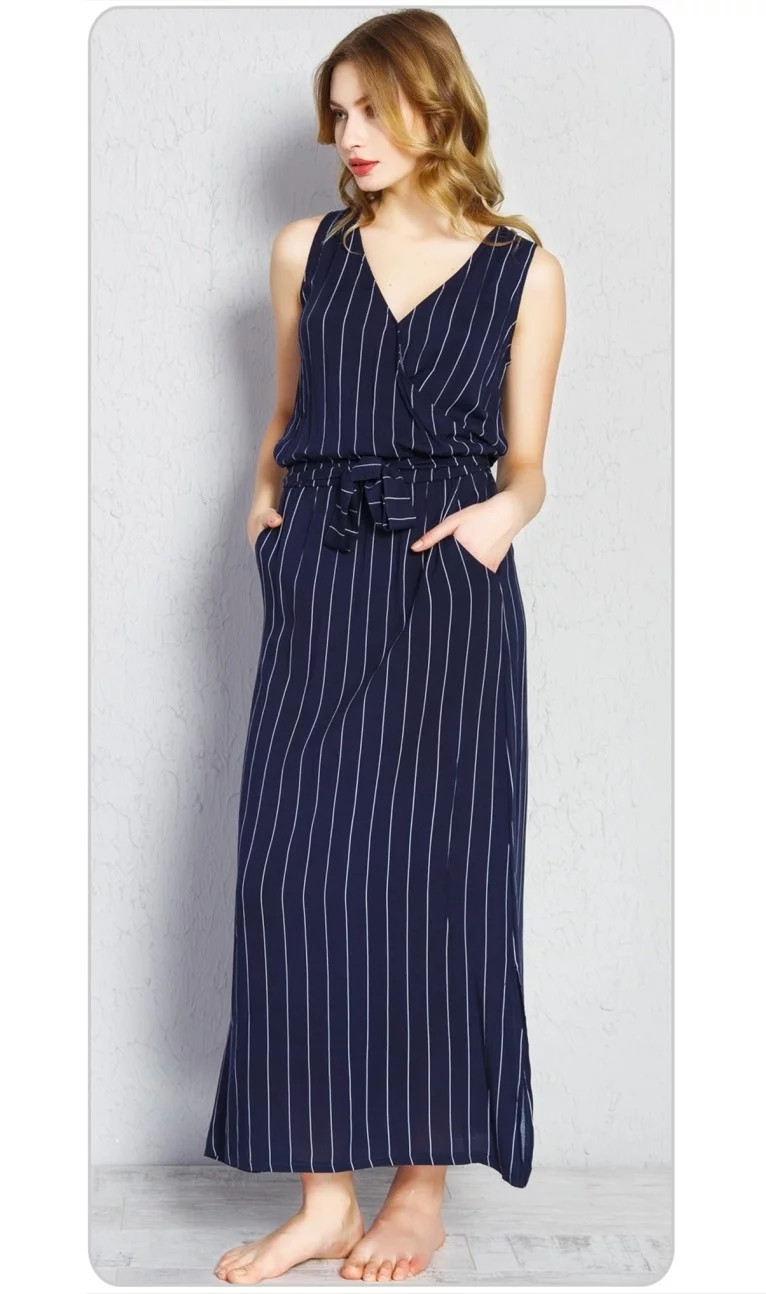 Dámské letní maxi šaty na ramínka Alena. Šaty mají široká ramínka, dvě všité kapsy gumu a pásek v pase. Použitý materiál je příjemný na dotek. Šaty využijete v kanceláři i na zahradní párty.