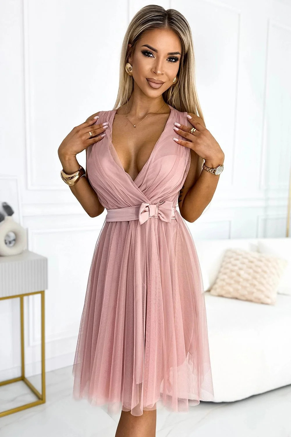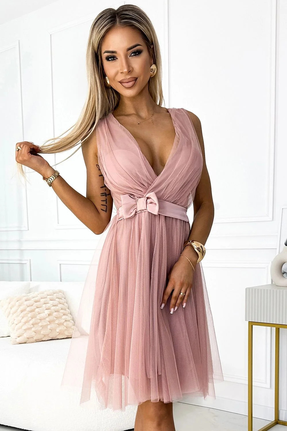 Dámské šaty 523-1 Numoco basic - starorůžová barva - ze vzdušného tylu - provokativní výstřih - saténová mašle - zadní část z elastické gumy - elegantní řasení spodní části