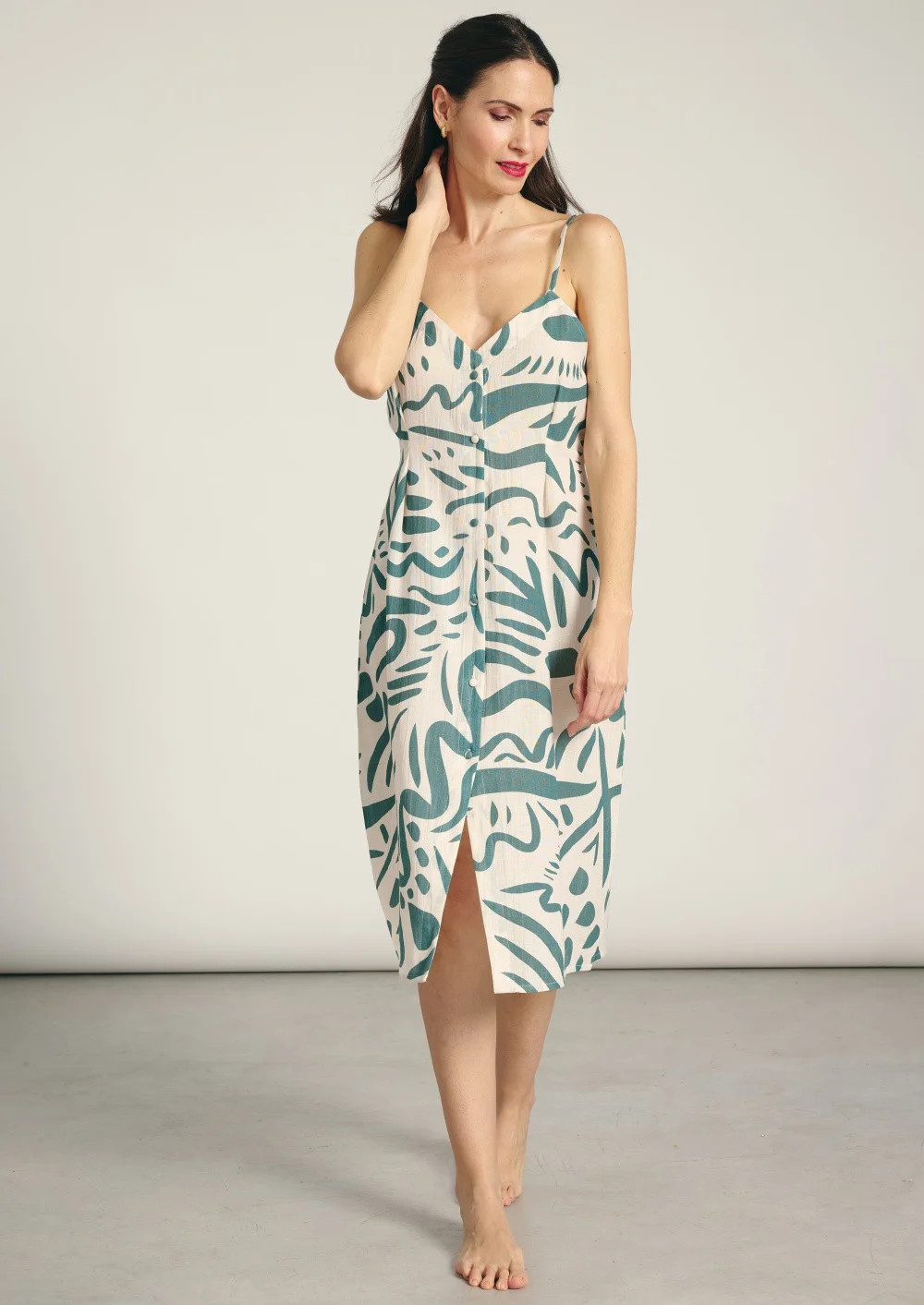 Dámské plážové šaty značky Muydemi. Šaty jsou vyrobeny ze 100% viskózy, ideální pro horké letní dny. Šaty jsou volné, celopropínací a délkou pod kolena. Šaty mají tenká ramínka a výstřih do "V".