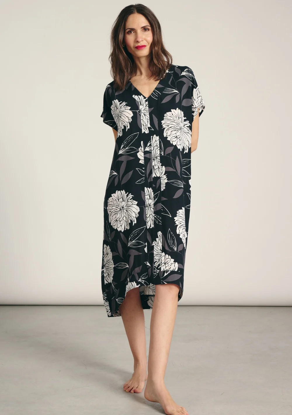 Dámské plážové šaty značky Muydemi. Šaty jsou vyrobeny ze 100% viskózy, ideální pro horké letní dny. Šaty jsou volné, jednoduchého střihu, s délkou pod kolena. Šaty mají krátký rukáv a výstřih do V.
