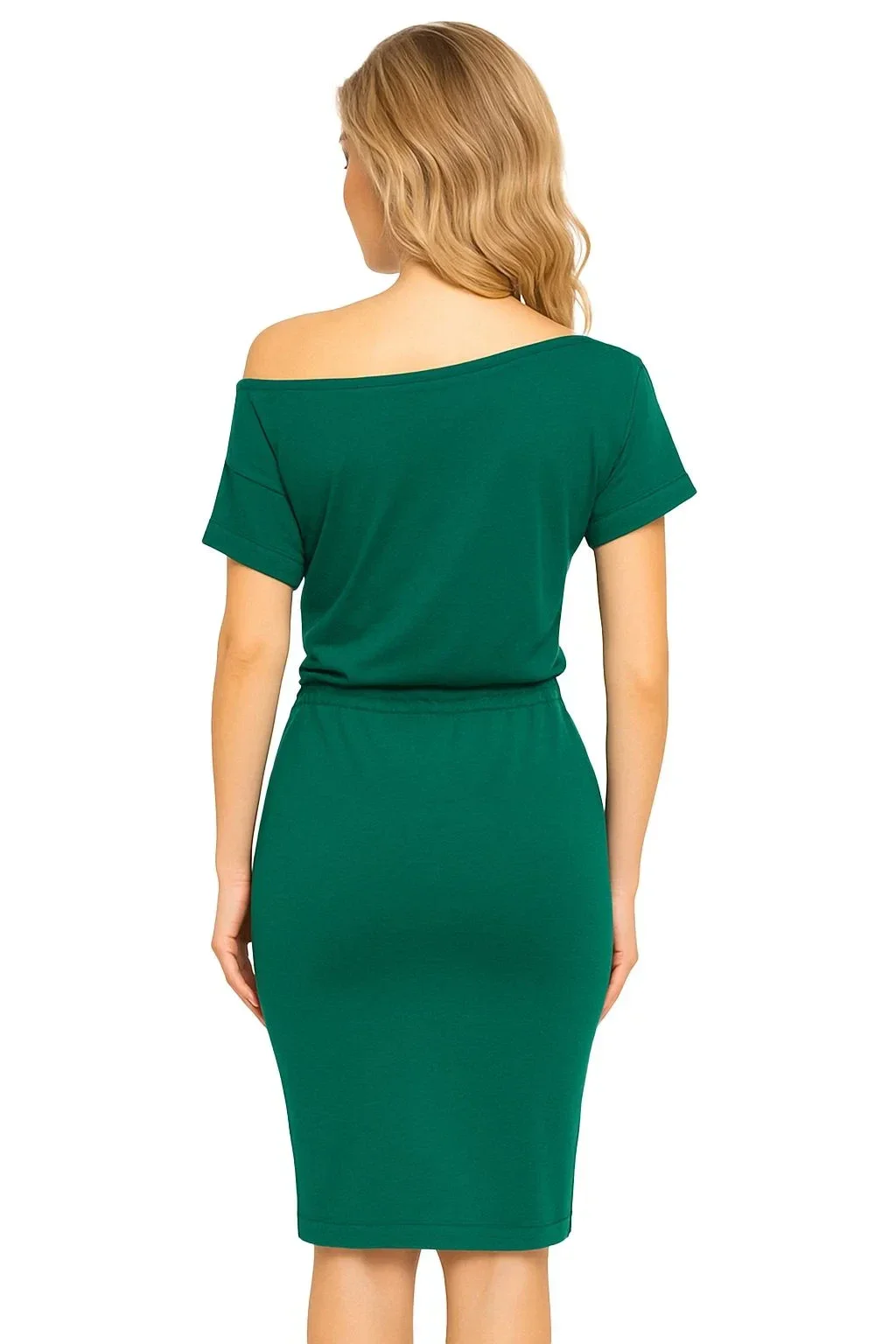 Dámské šaty 56-10 NUMOCO - zelená barva - z elastického materiálu - v pase tunýlek s tkaničkou na utažení - na bocích kapsy - délka nad kolena (v závislosti na výšce postavy)