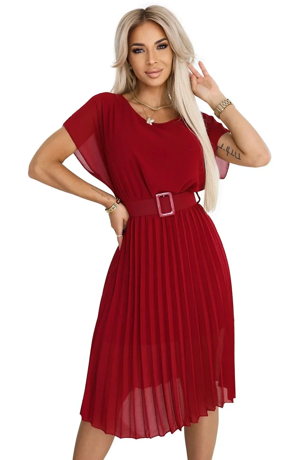 Dámské šaty 465-5 MIA Numoco basic - bordó barva - plisované šaty - kulatý výstřih - široký pásek - ze šifonu s podšívkou