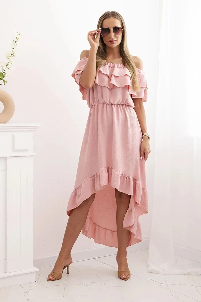 Tato dámské šaty typu "španělka" jsou ztělesněním ženského stylu a letní elegance. Model s efektními volány kolem výstřihu dodává romantický charakter a jemně odhaluje ramena, čímž vytváří mimořádně ženskou siluetu. Asymetrický spodní lem dodává šatům lehkost a každý pohyb v nich vypadá nádherně. Elastický pas se dokonale přizpůsobí postavě, zdůrazňuje ženské křivky a zajišťuje pohodlí po celý den. Ideální volba na dovolenou, letní večírky, rande nebo venkovní slavnosti. Díky kombinaci elegance a pohodlí se tyto šaty stanou Vaším oblíbeným letním kouskem. Velikost je univerzální a bude vhodná pro ženy ve velikosti S, M nebo L.