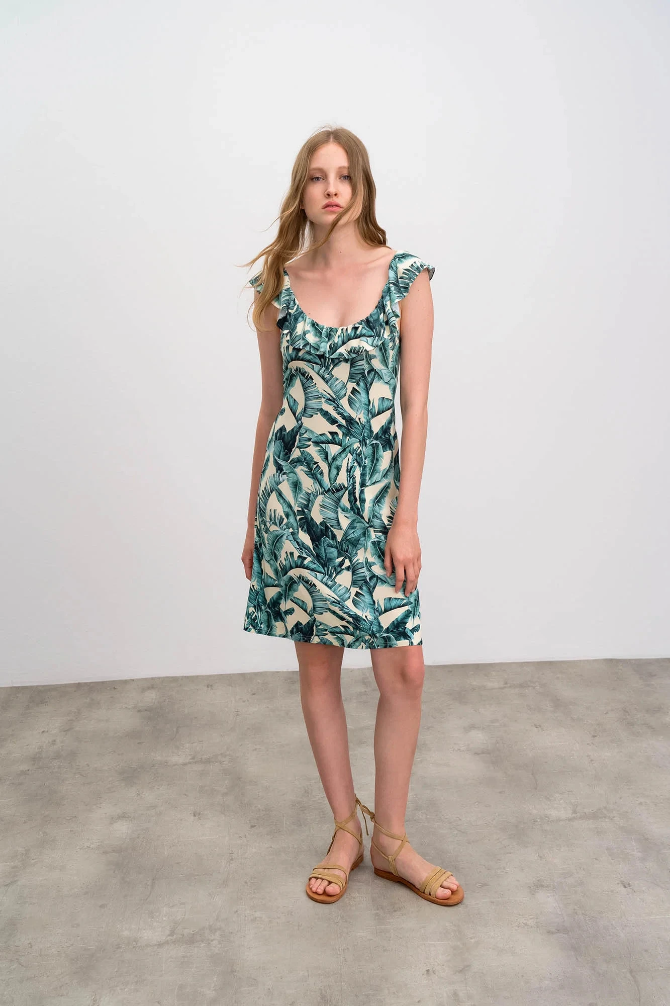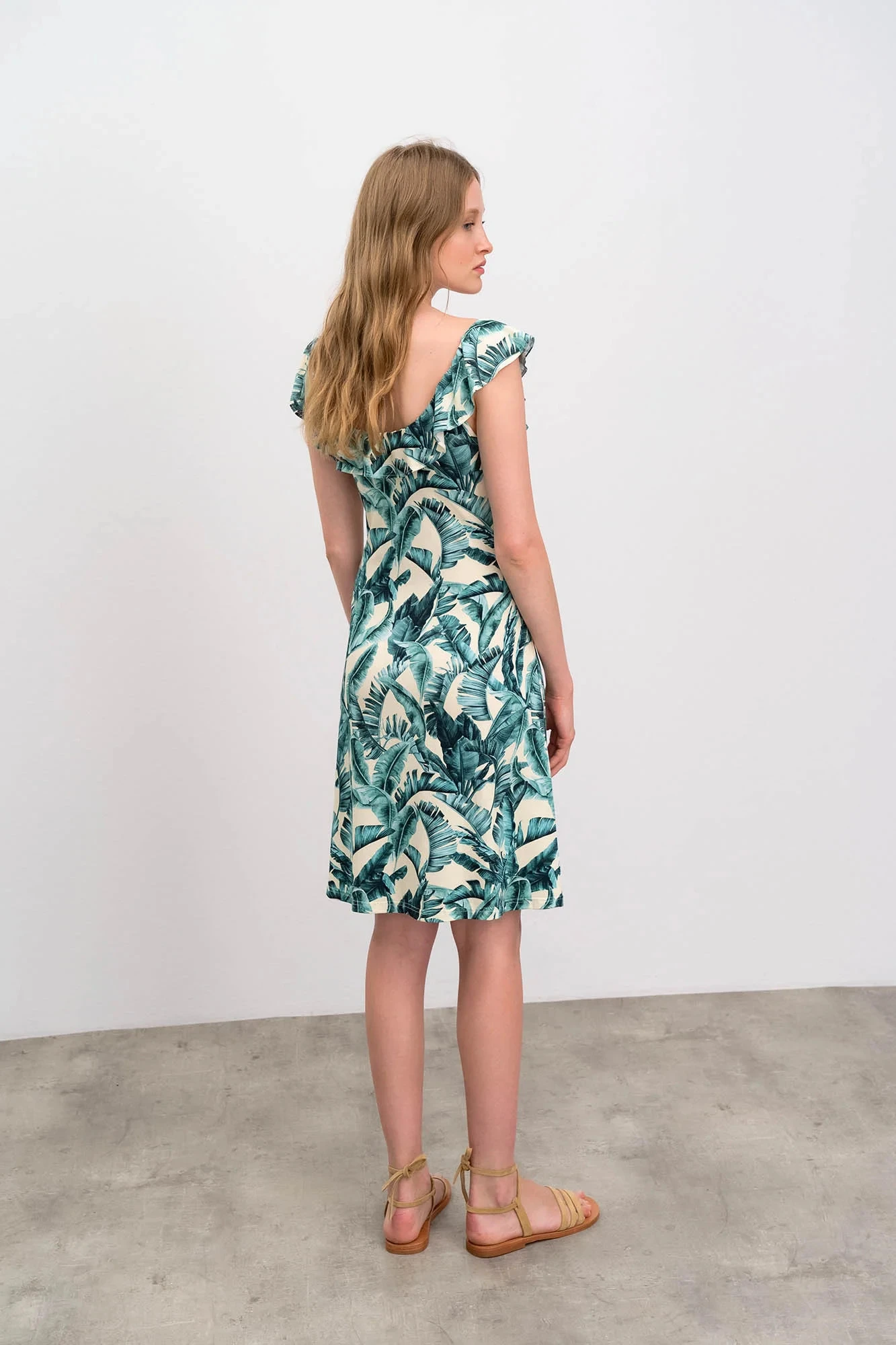 Elegantní dámské šaty s motivem listů s kulatým zřaseným volánovým výstřihem, vše co žena v parných letních dnech potřebuje. Šaty jsou vyrobené z kvalitní jersey viskózy s příměsí elastanu. Jersey Viscoza se vyznačuje vysokou savostí, je dobře prodyšná, měkká a příjemná na dotek a elastan zaručuje lepší pružnost tkaniny.