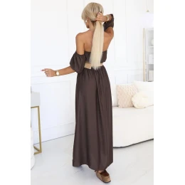 Dámské šaty 614-1 Numoco basic - čokoládová barva - ze vzdušného prodyšného materiálu - odhalená ramena - krátké rukávy typu puff - elastická vrchní část zajišťuje pohodlí nošení - pletený pásek s ozdobnou sponou - stylové maxi šaty jdou ideální na letní dny, procházky a prázdninové výlety