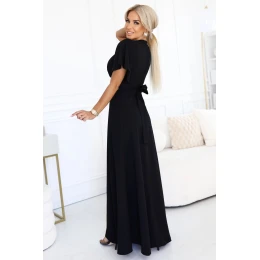 Dámské šaty 581-7 JENNIFER NUMOCO - černá barva - z lesklého brokátu - krátké rukávy - psaníčkový výstřih - dlouhý rozparek - vypasovaný střih s páskem