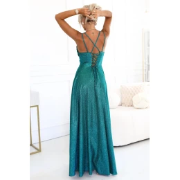 Dámské šaty 589-3 NUMOCO - zelená barva - z lesklého třpytivého materiálu - vodopádový výstřih - tenká ramínka - korzetové šněrování na zadní straně - smyslný rozparek na noze - ideální na plesy, svatby nebo večírky
