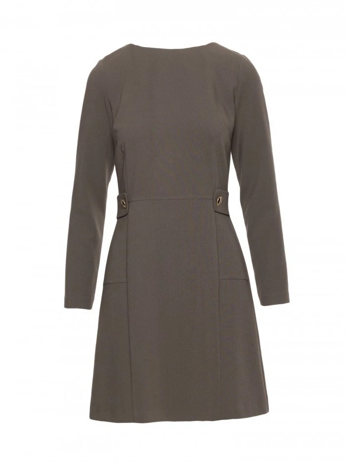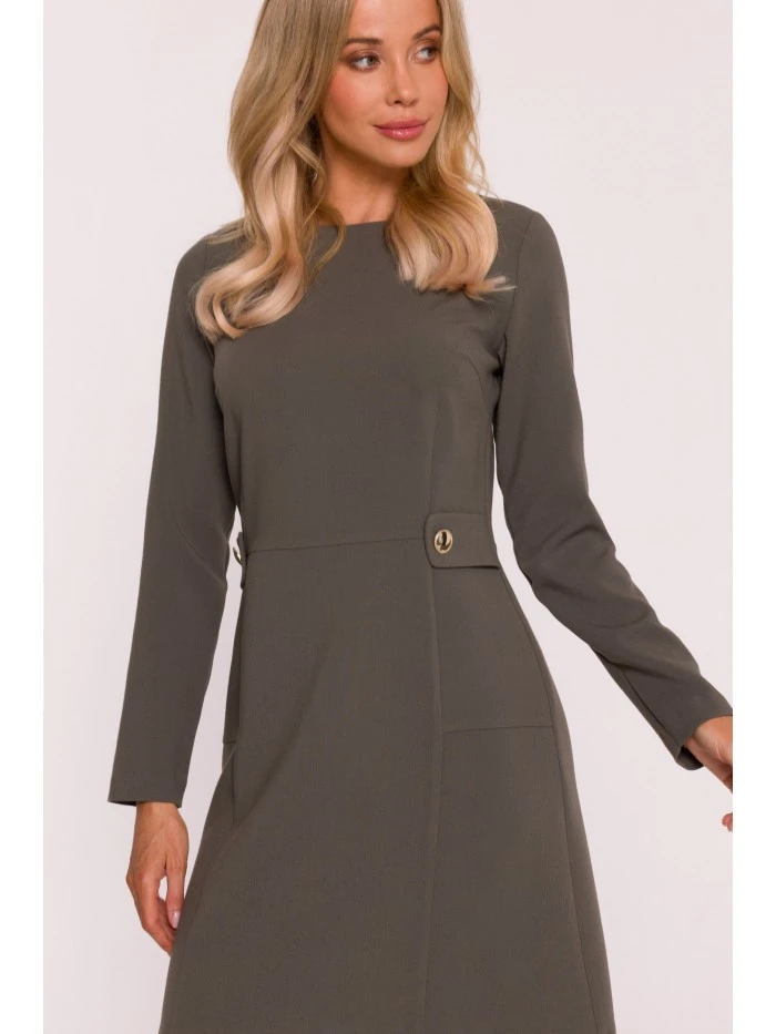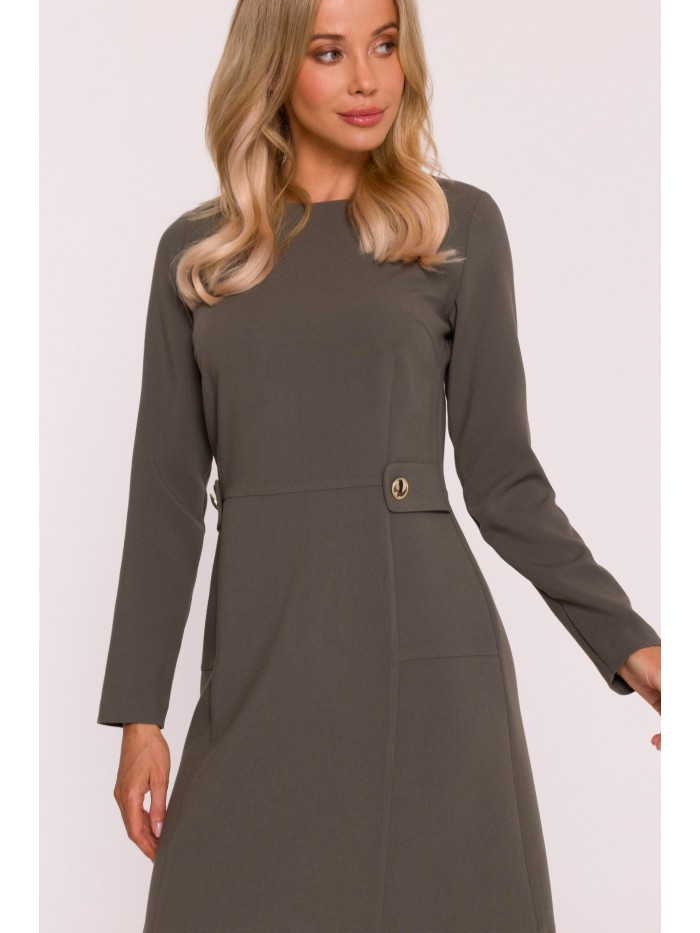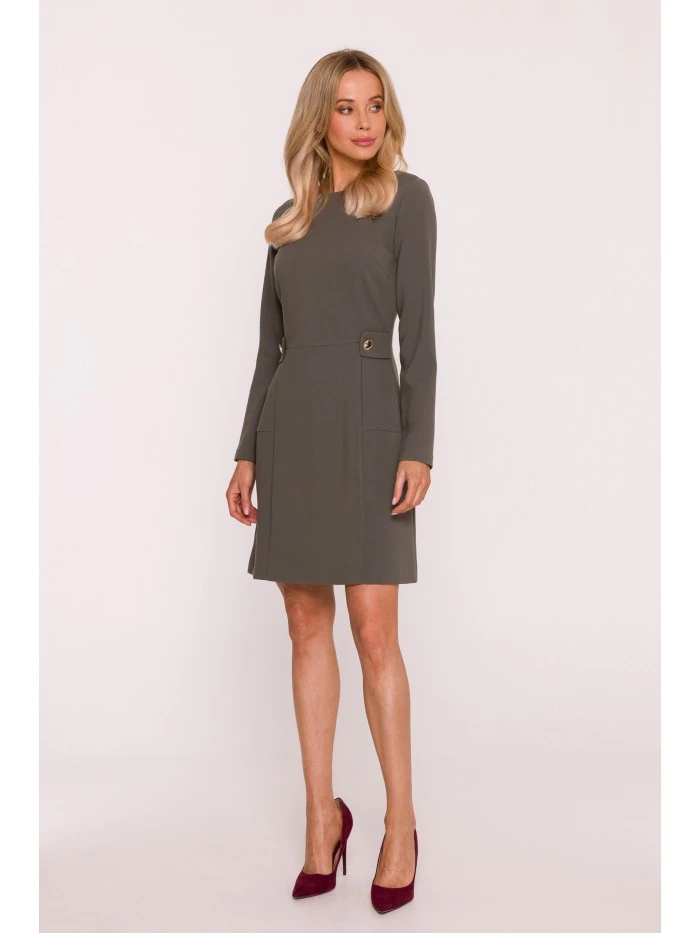LÁTKA Tkanina: hladká tkanina s jemným povrchem PODROBNOSTI O PRODUKTU Výstřih: zaoblený Rukávy: dlouhé Zapínání: skrytý zip na zádech Kapsy: žádné Detaily: ozdobné záložky v pase se zlatými knoflíky Model: S419 Navrženo a vyrobeno v Polsku Modelka je vysoká 174 cm a nosí velikost S STYL A STŘIH Styl: trapézové šaty, vypasovaný vršek s mírně rozšířenou sukní Tvar: decentní áčková linie Délka: mini, nad kolena