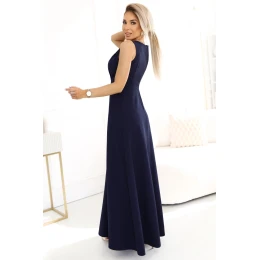 Dámské šaty 634-1 MIRA NUMOCO - tmavě modrá barva - měkký a vysoce kvalitní materiál - zavinovací střih - široká ramínka - maxi šaty s výrazněným pasem - efektní rozparek na noze - ideální na plesy, svatby, maturitní plesy