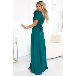 Dámské šaty 653-1 NUMOCO - zelená barva - krátké rukávy s odnímatelnou květinou - dekolt ve tvaru srdce zeštíhluje postavu - vysoký rozparek na noze - ideální na plesy, svatby, večerní události - dlouhé společenské šaty