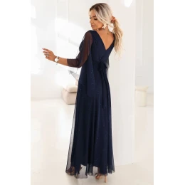 Dámské šaty 655-3 Numoco basic - tmavě modrá barva - z lehkého materiálu s jemný třpytivým povrchem - zavinovací V -výstřih tvaruje horní část - tříčtvrteční vzdušné rukávy s volánem - typ motýl - široký pás v pase - mírně rozšířený spodní díl - ideální na večírky, svatby, Silvestra nebo plesy