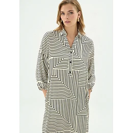 Dámské šaty z viskózy s jemným proužkovaným vzorem jsou elegantním a pohodlným kouskem vhodným pro každodenní nošení do práce nebo pro volný čas. Lehký materiál je příjemný na dotek a krásně splývá, což zajišťuje pohodlí po celý den. U krku mají šaty límeček s propínací légou, který dodává modelu upravený a nadčasový vzhled. Rukávy v 3/4 délce jsou lehce staženy do gumy, což jim propůjčuje jemný nabraný efekt a volnost pohybu. Díky všestrannému střihu a decentnímu designu se šaty snadno kombinují s doplňky a obuví pro různé příležitosti.