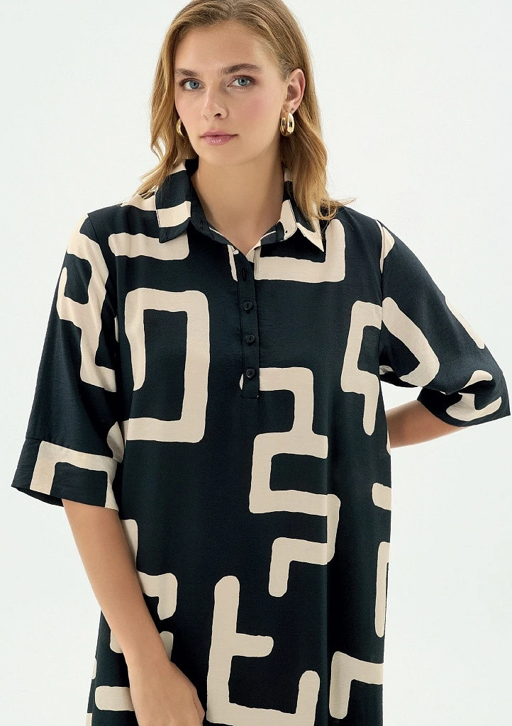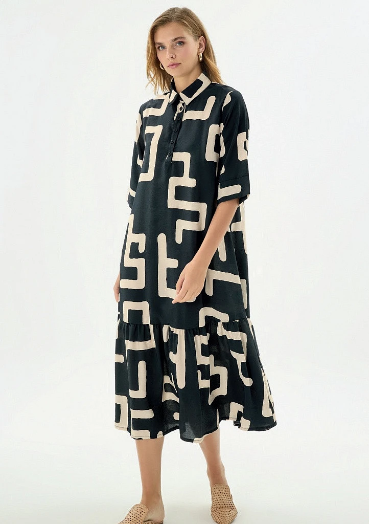 Košilové šaty z viskózy s délkou rukávu po lokty jsou elegantním a pohodlným kouskem vhodným pro každodenní nošení i slavnostnější příležitosti. Šaty jsou do poloviny těla propínací. Lehký materiál krásně splývá a zajišťuje volnost pohybu. Rukávy sahají po lokty a dodávají šatům sofistikovaný vzhled, zatímco spodní volán jemně zvýrazňuje ženskou siluetu a přidává šatům hravý, vzdušný detail.