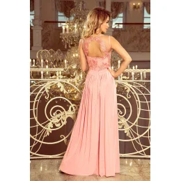 Elegantní dámské šaty 215-4 Numoco - dlouhá skládaná sukně s rozparkem - horní část bez rukávů s výšivkou - odhalená záda