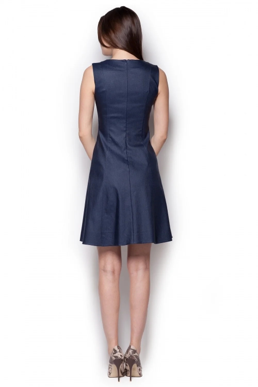 Dámské šaty bez rukávů M342 FIGL mají délku nad kolena. Klasický elegantní střih zdůrazňuje ženské linie těla. Výrobek je vhodný k mnoha příležitostem. K objednání ve třech barvách.