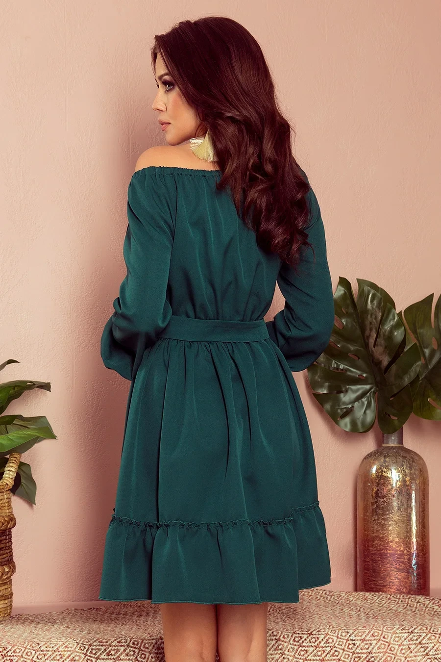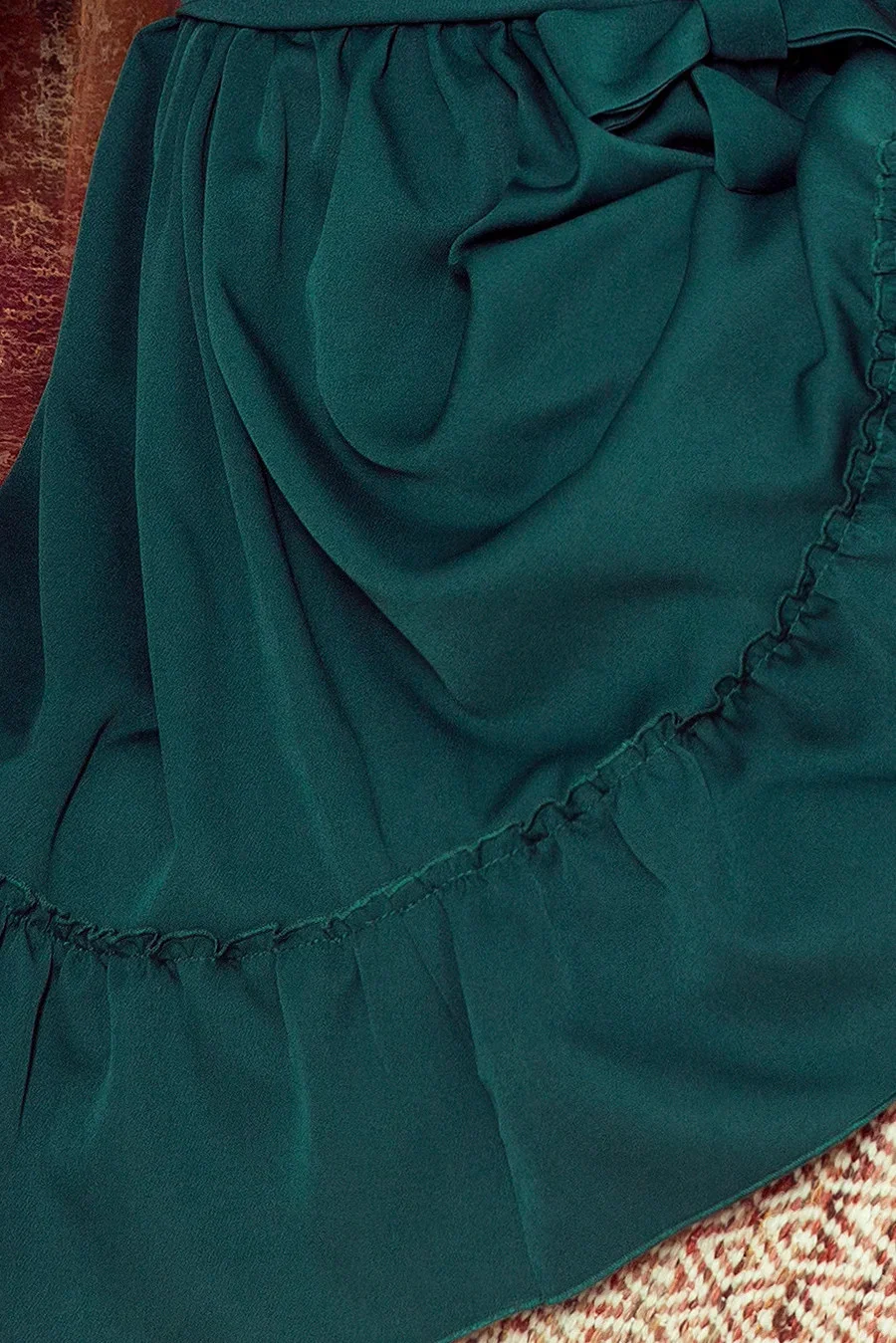 Dámské šaty 265-1 Daisy Numoco - lahvově zelená barva - volnějšího střihu - dlouhé nadýchané rukávy - na ramenou,v pase a na rukávech je našita elastická páska - s volánky - vázání v pase