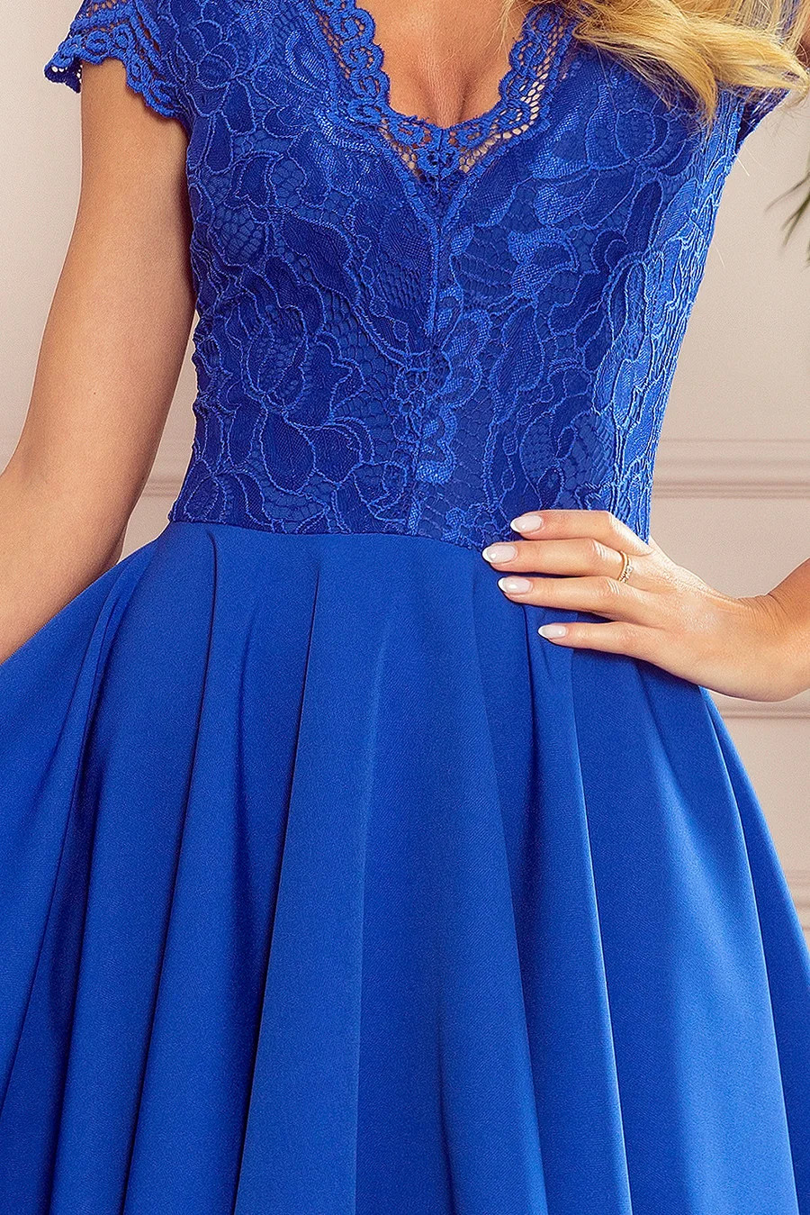 Exkluzivní šaty 300-3 Numoco - ideální pro vzácnou příležitost - zdobený výstřih ve tvaru V, který zdůrazňuje dekolt - horní část zdobená krajkou - dvouřadá volánová sukně dělá z modelu velmi elegantní kousek