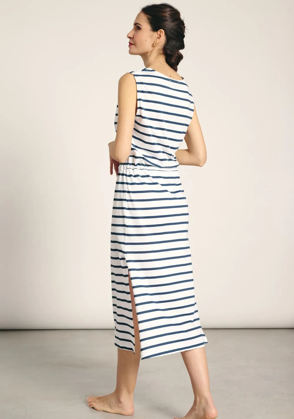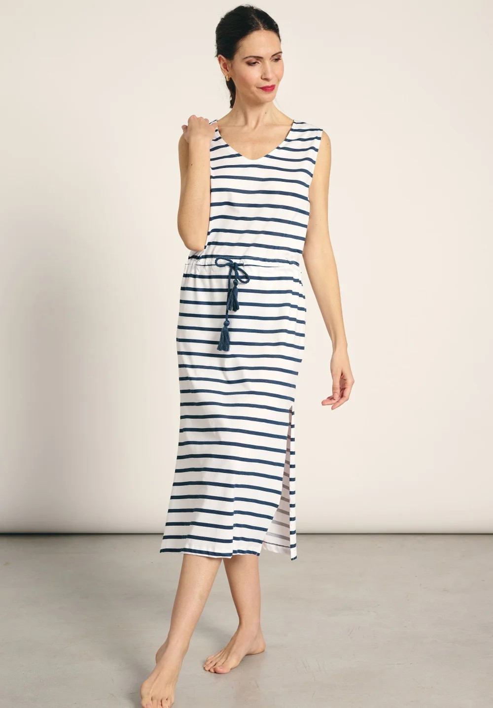 Dámské plážové šaty značky Muydemi. Šaty jsou vyrobeny z jemné bavlny, ideální pro horké letní dny. Šaty jsou volné, jednoduchého střihu s délkou pod kolena. Výstřih je do tvaru V. Šaty mají široké ramínka a na bocích mají rozparky. Šaty mají okrasnou šňůrku v pase, kterou lze šaty stáhnout.