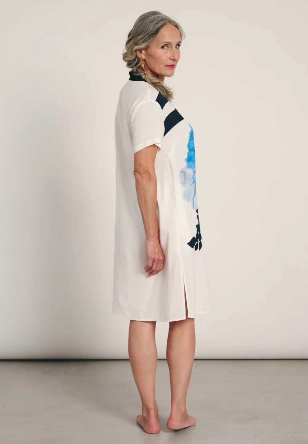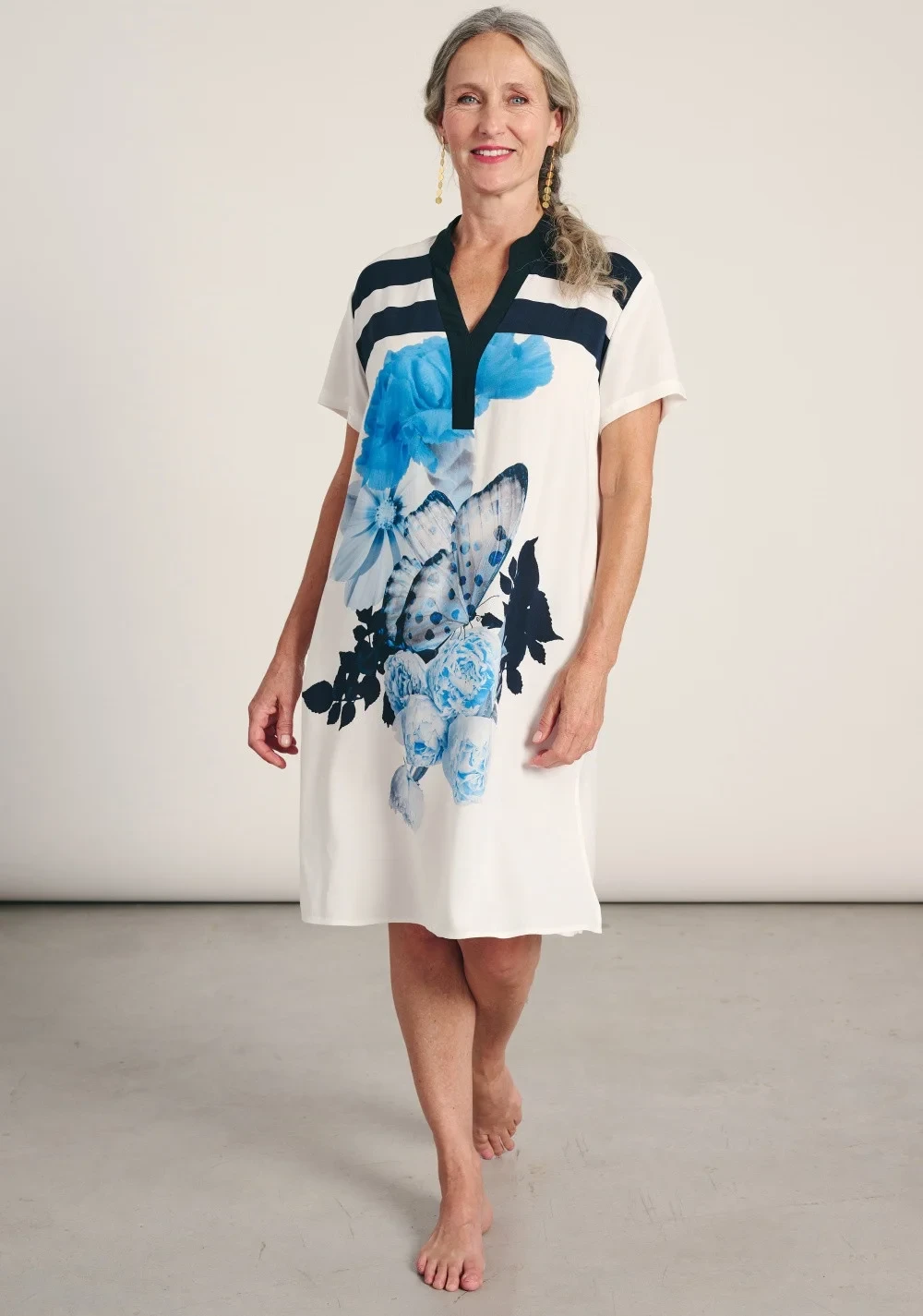 Dámské plážové šaty značky Muydemi. Šaty jsou vyrobeny ze 100% viskózy, ideální pro horké letní dny. Šaty jsou volné, jednoduchého střihu, s délkou nad kolena. Šaty mají krátký rukáv a výstřih do V.