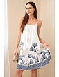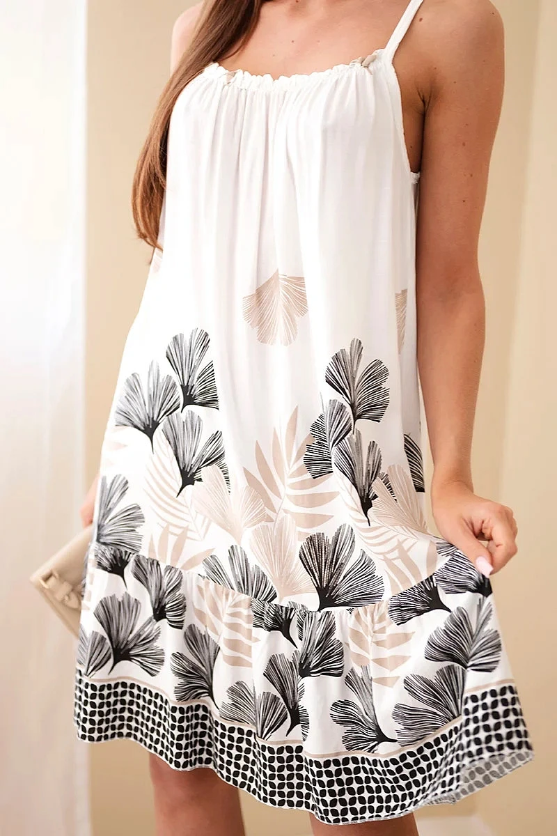 Dámské šaty na ramínka s potiskem jsou ideální volbou pro teplé dny pro ženy, které ocení lehkost a pohodlí v módním provedení. Vzdušný střih způsobuje, že se šaty krásně přizpůsobí postavě, zajišťují volnost pohybu a pohodlí při nošení po celý den. Vrchní část modelu je zdobena jemným řasením, které decentně zvýrazňuje dekolt a dodává celku ženský charakter. Tenká ramínka dodávají šatům lehkost a činí je skvělou volbou na léto, dovolenou nebo procházku po městě.