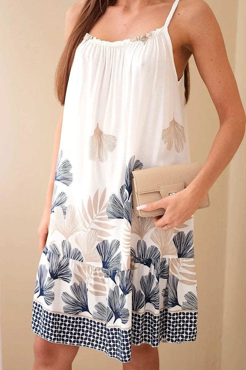 Dámské šaty na ramínka s potiskem jsou ideální volbou pro teplé dny pro ženy, které ocení lehkost a pohodlí v módním provedení. Vzdušný střih způsobuje, že se šaty krásně přizpůsobí postavě, zajišťují volnost pohybu a pohodlí při nošení po celý den. Vrchní část modelu je zdobena jemným řasením, které decentně zvýrazňuje dekolt a dodává celku ženský charakter. Tenká ramínka dodávají šatům lehkost a činí je skvělou volbou na léto, dovolenou nebo procházku po městě.