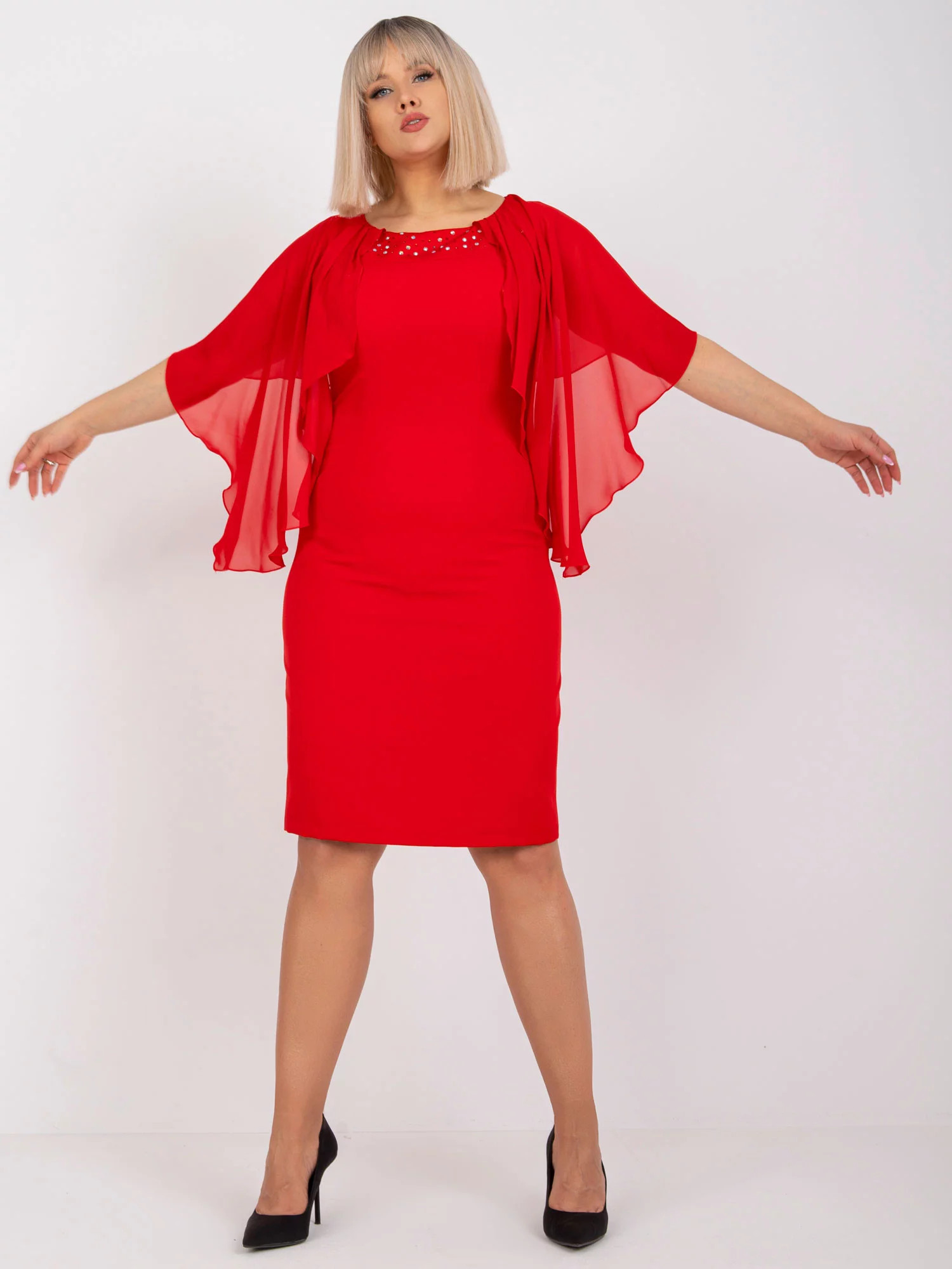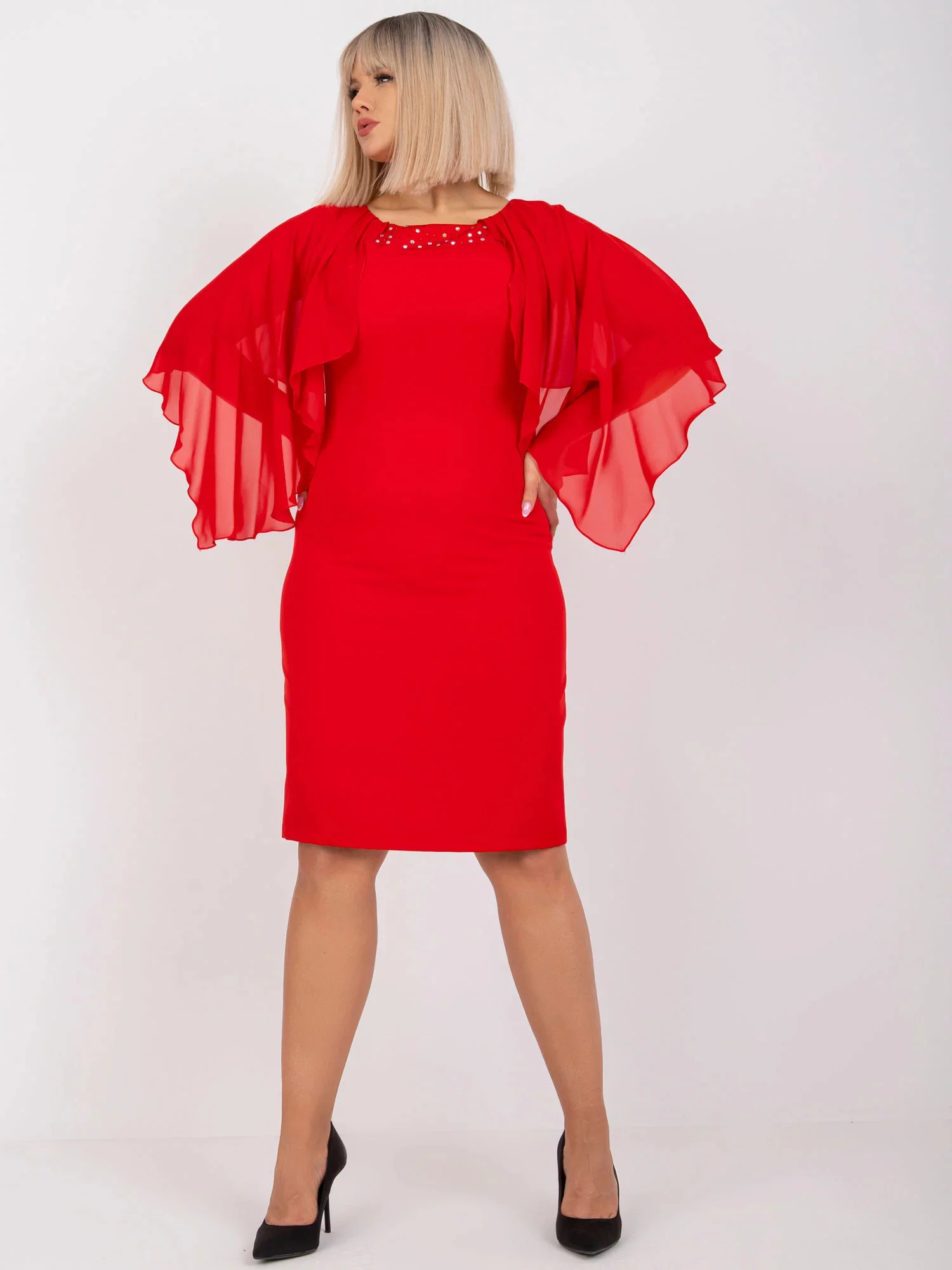 Modelka má na sobě velikost 42. Rozměry modelky: výška 172 cm, prsa 103 cm, pas 73 cm, boky 103 cm.