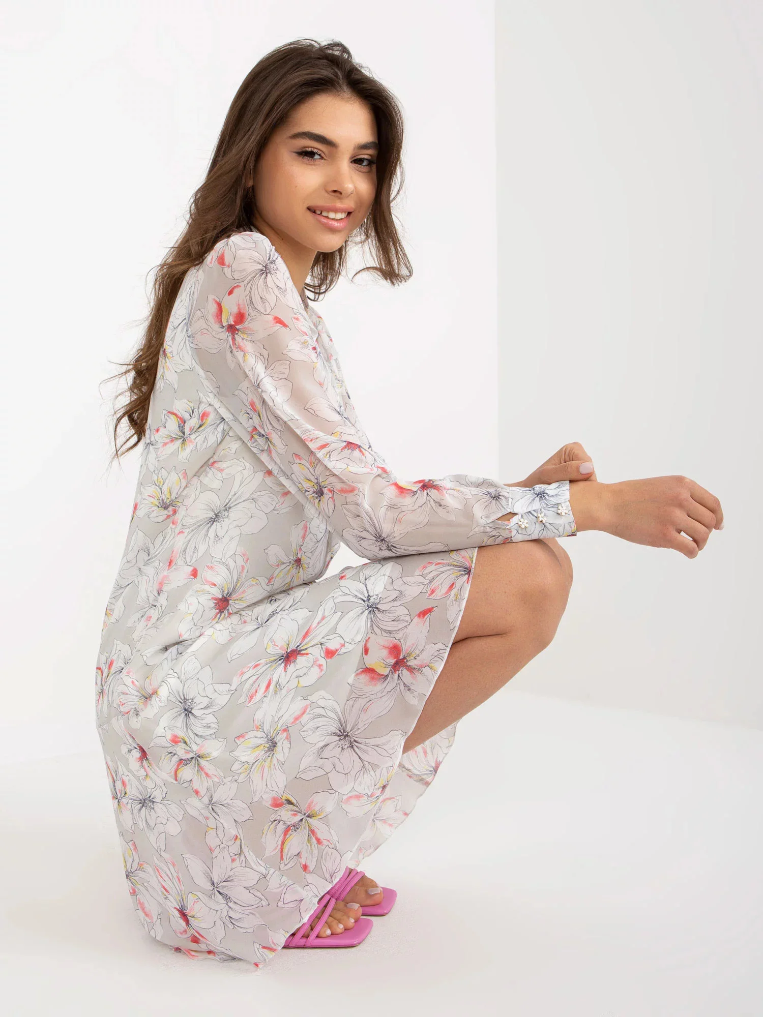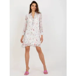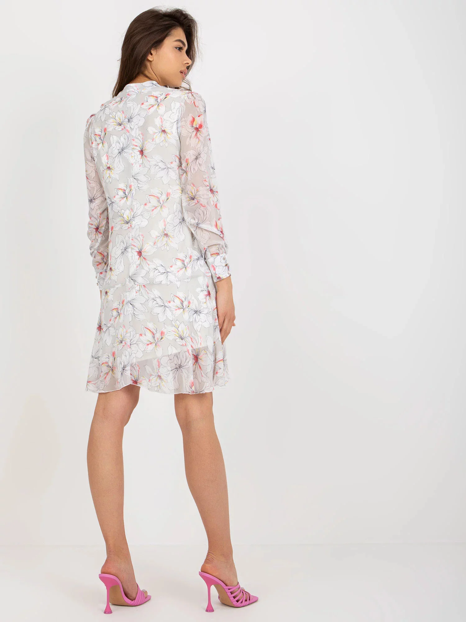 Rozměry šatů ve velikosti 36 měřené na plocho: šířka v podpaží - 46 cm, délka rukávu - 58 cm, celková délka - 85 cm.Světle šedé šaty s květinovým potiskem.