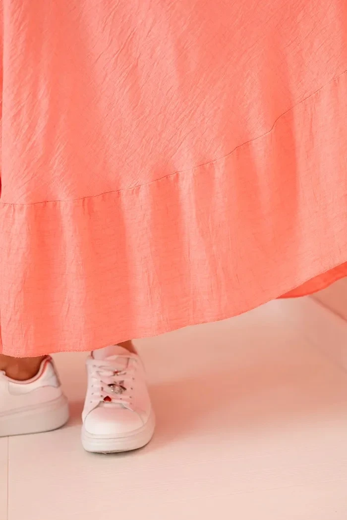 Volný, rozšířený střih s ozdobným volánem dole krásně padne na postavu, zakrývá případné nedokonalosti a zdůrazňuje ženské tvary. Krátký rukáv a výstřih do V dodávají lehkost a opticky zeštíhlují horní část těla. Ideální šaty na každodenní nošení, procházky, dovolenou nebo neformální setkání.