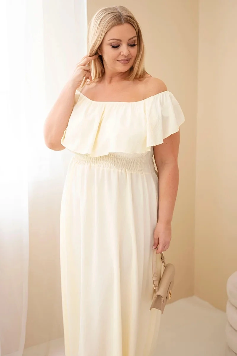 Lehké a mimořádně ženské maxi šaty jsou ideální volbou pro jarní a letní dny. Model vyniká efektním volánem v horní části, který se krásně usazuje na ramenou a dodává outfitu romantický a jemný charakter. Elastický pas se výborně přizpůsobí postavě, zvýrazní její přednosti a zajišťuje pohodlí po celý den.