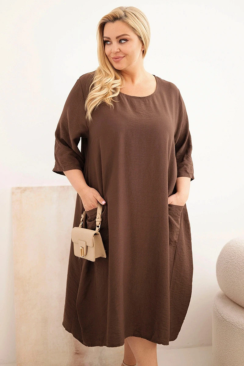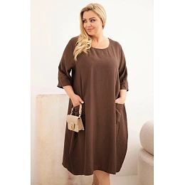 Dámské šaty plus size z viskózy s kapsami krátký rukáv hnědá