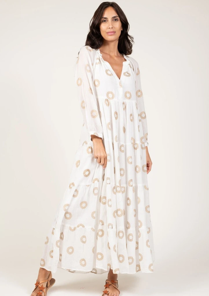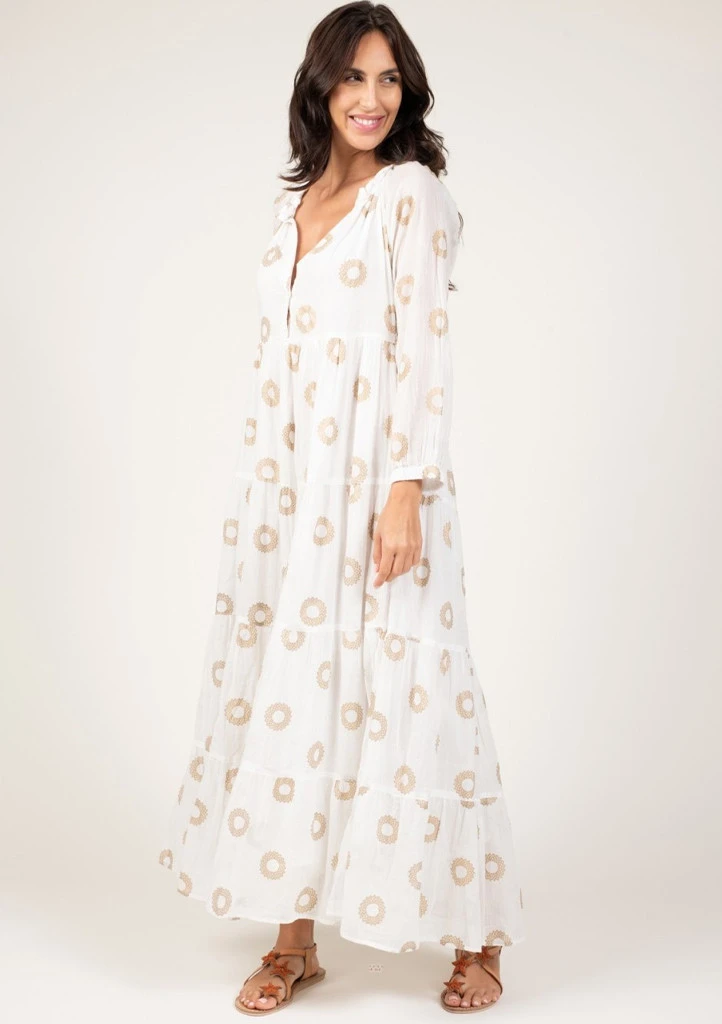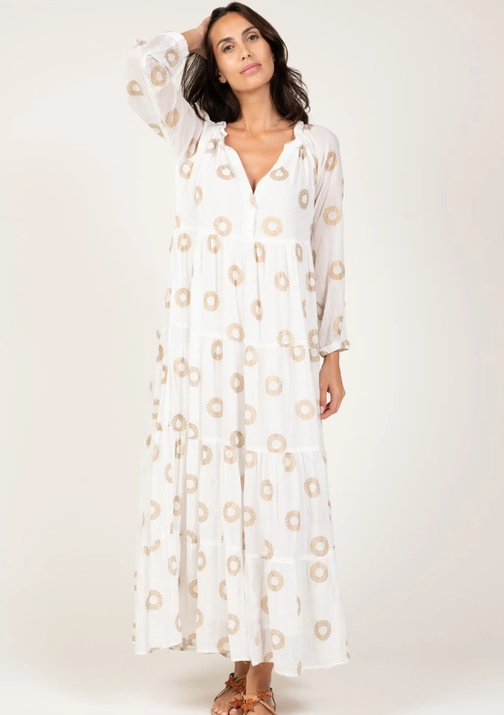 Lehkost, ženskost a francouzský šarm v jednom – to jsou tyto bílé maxi šaty od značky Terre Rouge. Jsou ušité z příjemného vzdušného materiálu, ideálního na teplé dny. Jemný zlatý vzor po celé délce dodává šatům nádech elegance a originality. Volný střih s nabíranými patry, výstřih do V a dlouhé rukávy zakončené gumičkou podtrhují uvolněný, ale stylový vzhled. Skvělé na dovolenou, letní oslavy i procházku městem.