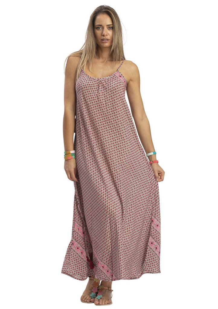 Dopřejte si pohodlí a svobodu v lehkých letních maxi šatech od francouzské značky Terre Rouge. Jemný etno vzor v růžovo-červených tónech v kombinaci s volným střihem vytváří ideální outfit pro horké dny. Šaty mají tenká nastavitelná ramínka, volně splývavou siluetu a ozdobné detaily ve spodní části, které dodávají na originalitě. Ideální k moři, na festival nebo pro uvolněné letní chvíle.