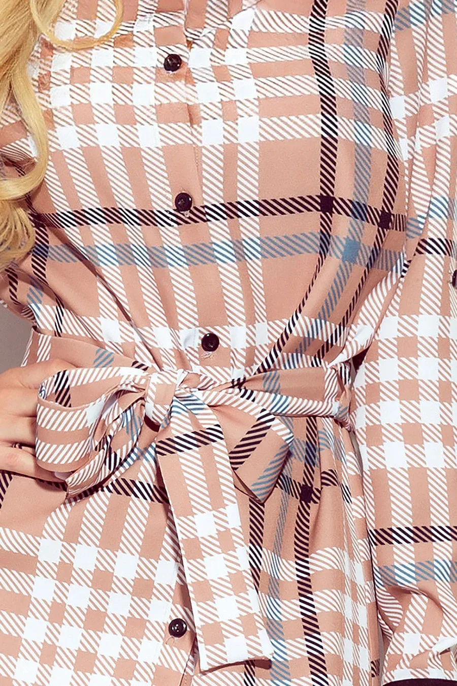Šaty je možné nosit také rozepnuté jako kabátek. Tento model značky Numoco je vyrobený z málo pružného materiálu příjemného na dotyk (95 % polyester, 5 % elastan). Šaty jsou k dostání v béžové-bílé barvě s károvaným vzorem a s černými manžetami.