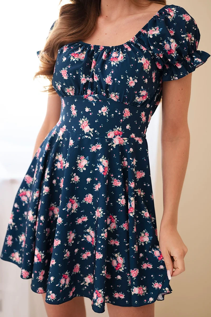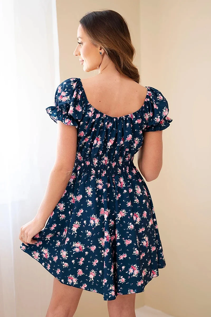 Dámské šaty s květinovým vzorem s nabíraným rukávem a elastickým pasem tmavě modré