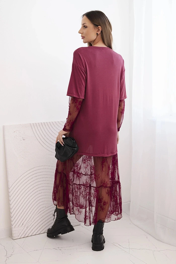 Tento dámský šaty s tylovým spodkem a rukávy jsou ideální volbou pro ženy, které se rády odlišují stylovým a zároveň pohodlným oblečením. Vrchní část je vyrobena z měkkého modalového materiálu, který zajišťuje pohodlí při nošení, a lehce oversize střih zaručuje volnost pohybu. Naopak lehce průhledný tylový spodek a rukávy dodávají celku lehkost a módní, ženský charakter.