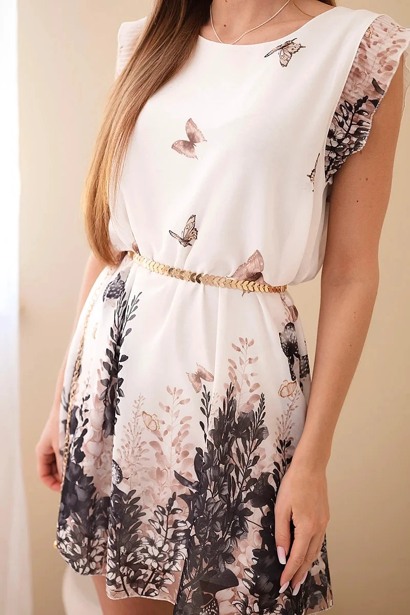 Dámské šaty s plisovaným rukávem a ozdobným páskem jsou elegantní a ženskou volbou, která se výborně hodí jak na každý den, tak při výjimečných příležitostech. Lehký, vzdušný střih způsobuje, že se šaty krásně přizpůsobí postavě a zvýrazní její přirozený tvar. Jemný vzor s motivy přírody a motýlů dodává stylizaci výjimečný charakter a něžnost.
