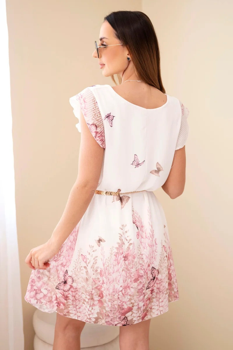 Dámské šaty s plisovaným rukávem a ozdobným páskem jsou elegantní a ženskou volbou, která se výborně hodí jak na každý den, tak při výjimečných příležitostech. Lehký, vzdušný střih způsobuje, že se šaty krásně přizpůsobí postavě a zvýrazní její přirozený tvar. Jemný vzor s motivy přírody a motýlů dodává stylizaci výjimečný charakter a něžnost.