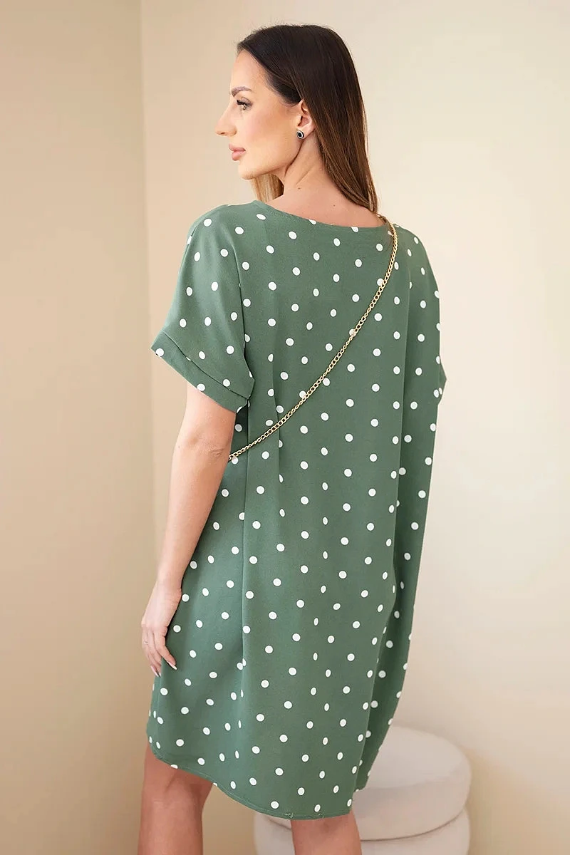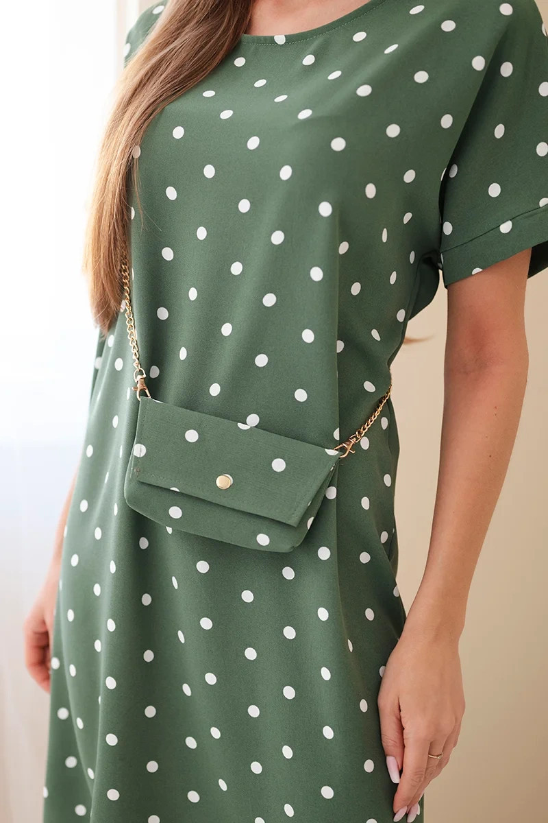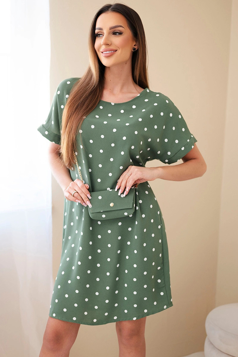 Dámské šaty s puntíky s krátkým rukávem a kabelkou khaki