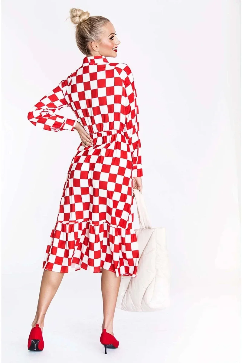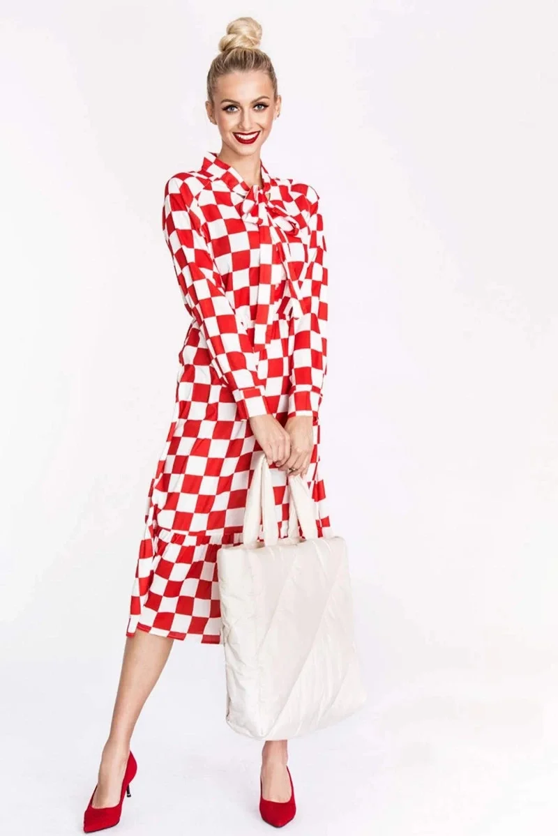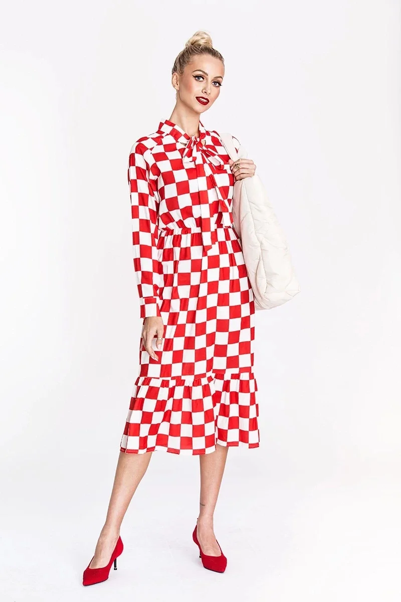 Šaty mají vázání ve výstřihu. Vrchní část šatů se zapíná knoflíčky. Model má dlouhé rukávy s manžetami a pod poprsím má gumičku. Rozšířenou spodní část modelu lemuje volánek. Šaty mají délku pod kolena.