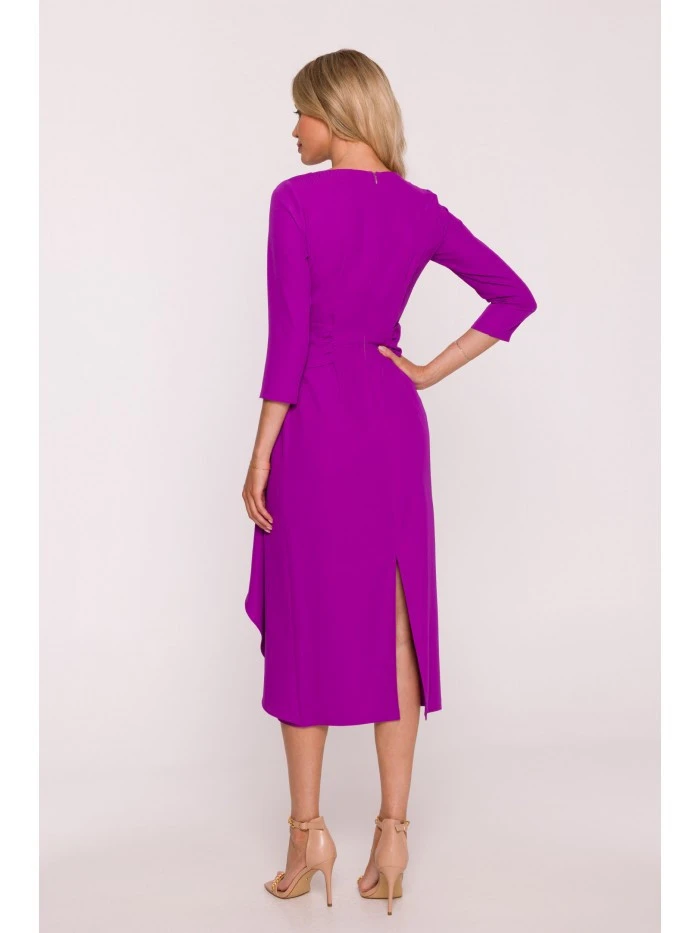 Materiál: 95% polyester 5% elastan LÁTKA: hladká tkanina s jemným leskem PODROBNOSTI O PRODUKTU Výstřih: kulatý Rukávy: 3/4 délky Sukně: rovná, s ozdobným volánem podél boční linie sukně, vzadu vysoký rozparek Pas: zvýrazněný jemným střihem a látkovým překrytím Zapínání: skrytý zip na zádech Model: S425 Navrženo a vyrobeno v Polsku Modelka je vysoká 174 cm a nosí velikost S STYL A STŘIH Styl: elegantní koktejlové šaty s volánem Tvar: mírně vypasovaná silueta, rovná sukně zvýrazněná ozdobnými prvky Délka: midi - pod kolena
